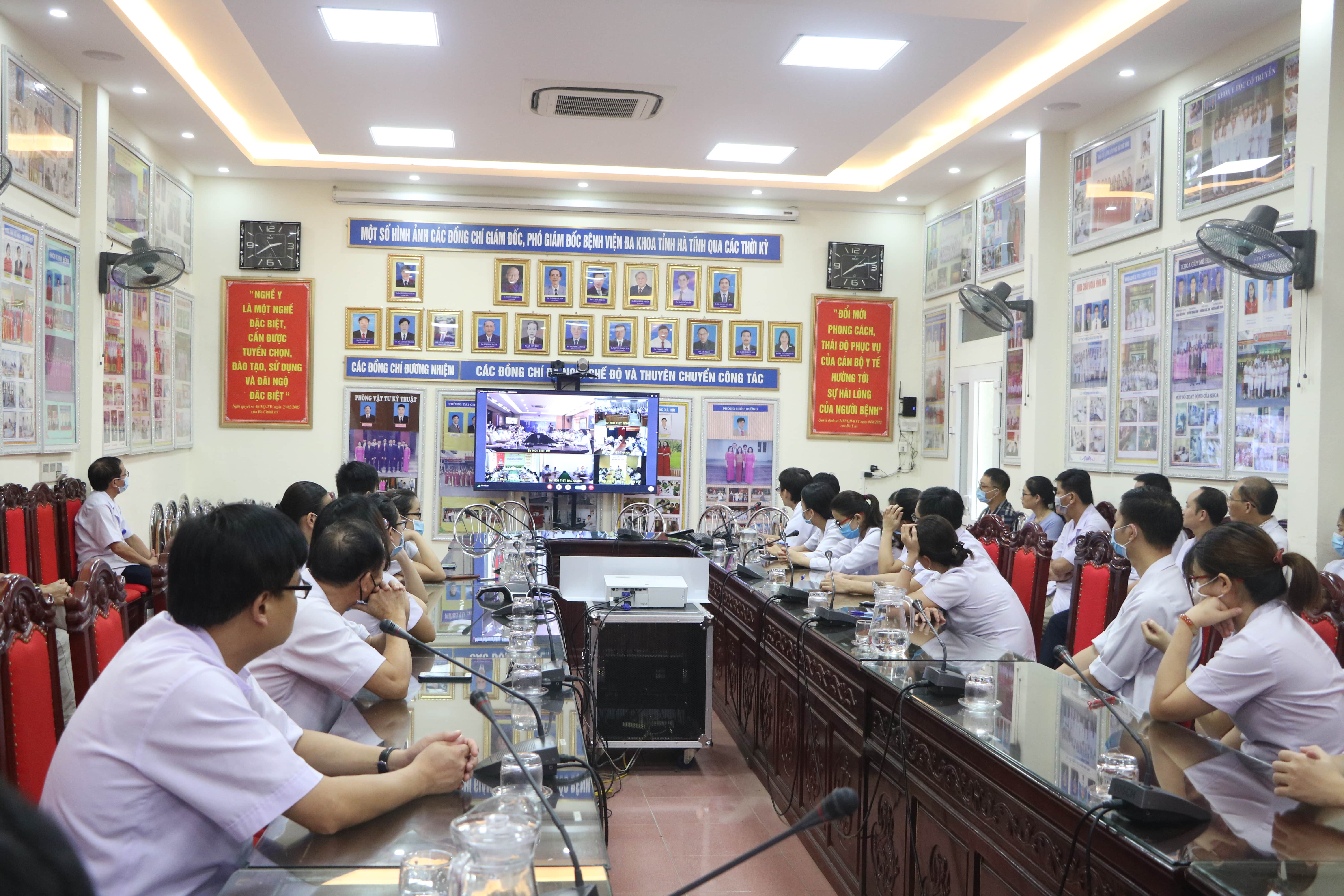 Chiều ngày 22/07/2020, Bệnh viện Đa khoa tỉnh Hà Tĩnh phối hợp với Bệnh viện Đại học Y Hà Nội tổ chức khám bệnh từ xa cho bệnh nhân nặng đang điều trị tại bệnh viện qua hình thức hội chẩn trực tuyến.