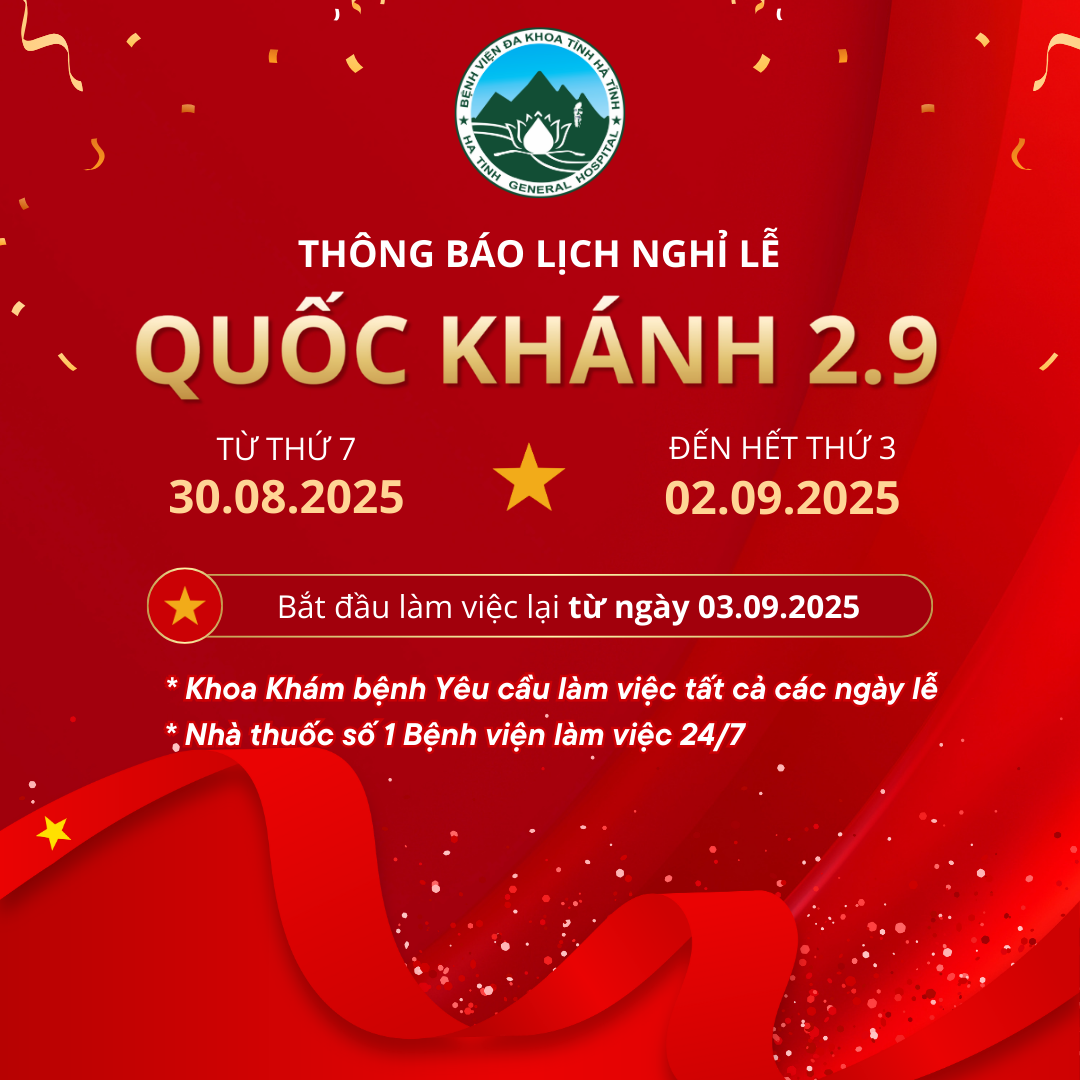 Bệnh viện Đa khoa tỉnh Hà Tĩnh vừa ban hành công văn số 839/BVĐKT-KHTH, ngày 28/08/2025 về việc đảm bảo trật tự, an toàn giao thông, công tác khám, chữa bệnh trong dịp nghỉ Lễ Quốc khánh 02/09/2025.