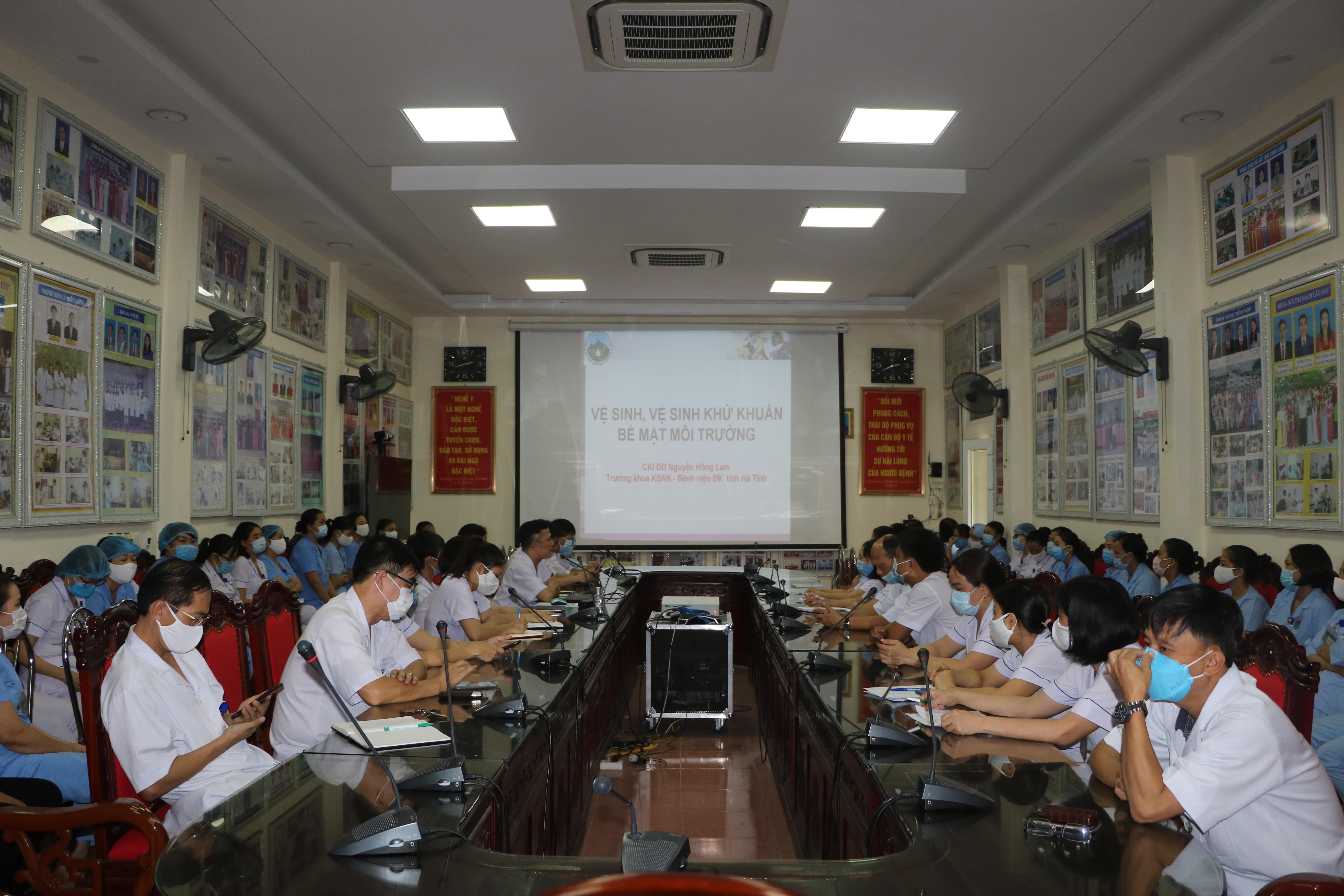 Để bổ sung và cập nhật kiến thức cho nhân viên y tế trong việc thực hành công tác vệ sinh bề mặt môi trường tại Bệnh viện trước tình hình diễn biến phức tạp của dịch Covid – 19, chiều ngày 14/08/2020, Bệnh viện đa khoa tỉnh Hà Tĩnh đã tổ chức lớp tập huấn vệ sinh môi trường bề mặt cho đội ngũ điều dưỡng, hộ lý trong toàn Bệnh viện.