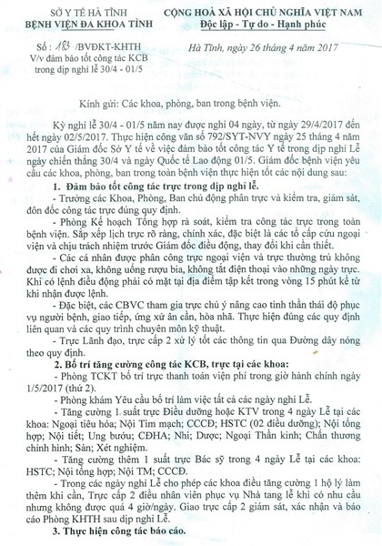 Phát biểu kết luận, đồng chí Phó Giám đốc Sở Y tế, Giám đốc bệnh viện nhấn mạnh: “Để bảo đảm tốt công tác khám, chữa bệnh cho nhân dân trong dịp nghỉ lễ, yêu cầu toàn thể CBVC Bệnh viện nghiêm túc chấp hành theo công văn số 729/SYT-NVY ngày 25/4/2017 của Sở Y tế và Công văn số 183/BVĐKT-KHTH của Bệnh viện đa khoa Tỉnh, đồng thời mổi Khoa, phòng, ban và mổi CBVC cần phải chủ động, nỗ lực hết mình trong công tác chăm sóc sức khỏe nhân dân. Luôn luôn sẵn sàng về nhân lực, vật lực đáp ứng tốt nhu cầu, nhiệm vụ khi có các tình huống như: thảm họa, tai nạn hàng loạt... xảy ra trên địa bàn, bảo đảm phục vụ một cách tốt nhất nhu cầu khám chữa bệnh của nhân dân và khi có sự điều động của cấp trên”.