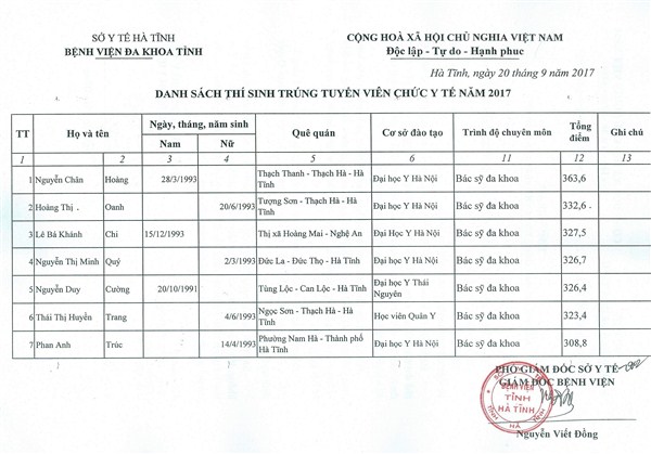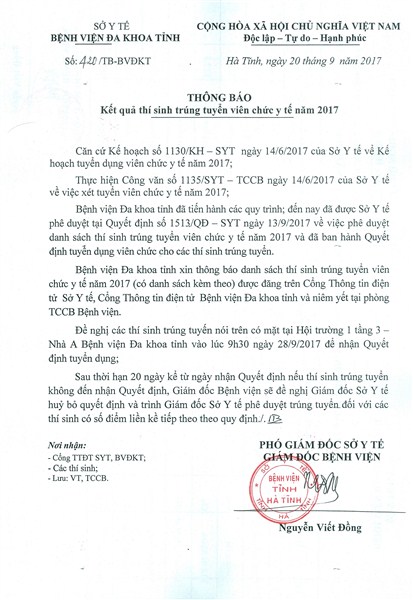 Sau quá trình triển khai việc thi tuyển viên chức y tế năm 2017 nghiêm túc, đúng quy chế, quy định, đảm bảo công bằng, dân chủ, Bệnh viện Đa khoa tỉnh Hà Tĩnh đã tuyển đủ 07 thí sinh theo chỉ tiêu, kế hoạch đề ra. Nay bệnh viện thông báo với các thí sinh trúng tuyển đến Bệnh viện Đa khoa tỉnh để nhận quyết định tuyển dụng.