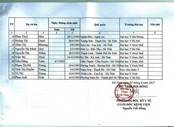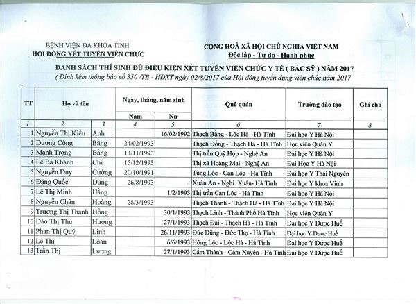Danh sách 24 thí sinh đủ điều kiện xét tuyển viên chức y tế (Bác sỹ) năm 2017 tại Bệnh viện Đa khoa tỉnh Hà Tĩnh