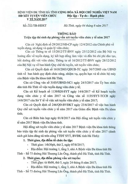 Hội đồng xét tuyển viên chức y tế năm 2017, Bệnh viện Đa khoa tỉnh thông báo triệu tập thí sinh dự phỏng vấn xét tuyển viên chức y tế năm 2017. Kế hoạch cụ thể như sau: