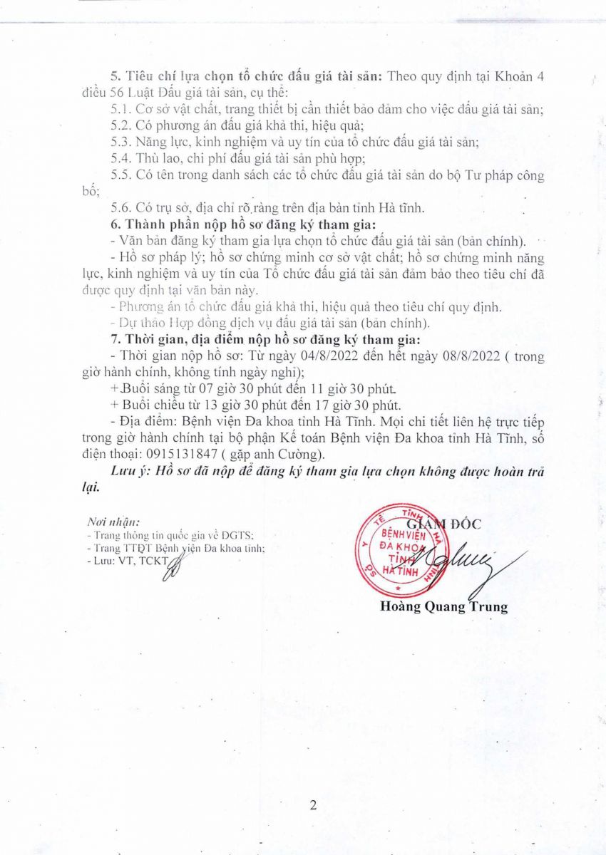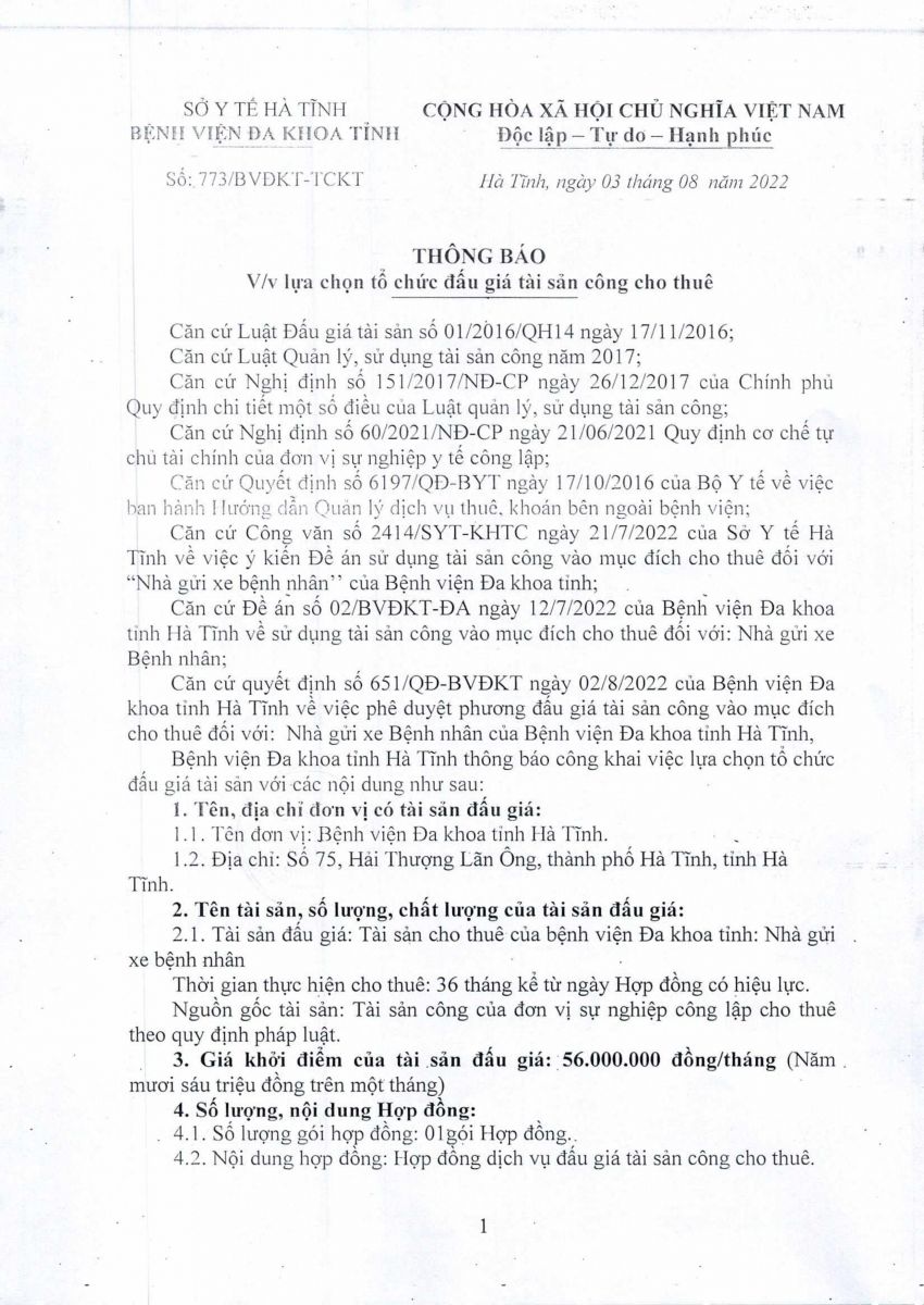 Căn cứ quyết định số 651/QĐ-BVĐKT ngày 02/08/2022 của Bệnh viện Đa khoa tỉnh Hà Tĩnh về việc phê duyệt phương đấu giá tài sản công vào mục đích cho thuê đối với : Nhà gửi xe Bệnh nhân của Bệnh viện Đa khoa tỉnh Hà Tĩnh.
