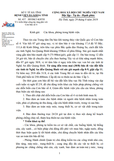 Thực hiện Công văn số 1853/SYT-VP của Sở Y tế Hà Tĩnh về việc triển khai công tác y tế ứng phó với Áp thấp nhiệt đới và mưa lũ trên địa bàn tỉnh, Giám đốc Bệnh viện Đa khoa tỉnh Hà Tĩnh yêu cầu các khoa, phòng thực hiện tốt kế hoạch chủ động ứng phó tại Công văn số 457/BVĐKT - KHTH ngày 29/08/2019.