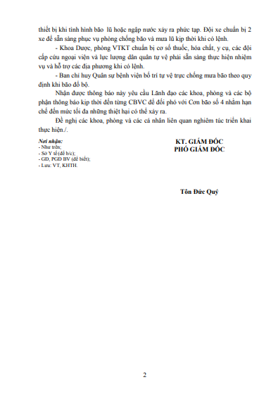 Do thời gian cơn bão đổ bộ vào đất liền khu vực Hà Tĩnh trùng vào dịp cuối tuần và nghỉ lễ 2/9, để chủ động triển khai các biện pháp phòng chống với các diễn biến của Cơn bão số 4, Giám đốc bệnh viện yêu cầu các khoa, phòng thực hiện các nội dung sau: