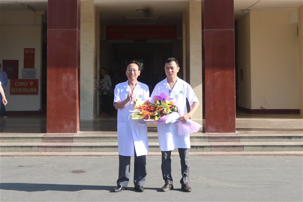Thầy thuốc ưu tú, Bác sĩ chuyên khoa II Vương Kim Đức, Chủ tịch Công đoàn kiêm Trưởng khoa Nội Tổng hợp tặng hoa cho cá nhân hiến máu góp phần cứu sống bệnh nhân qua cơn nguy kịch, đồng chí Nguyễn Hồng Lam, Trưởng khoa Kiểm soát nhiễm khuẩn.