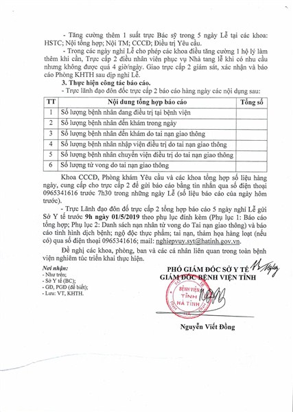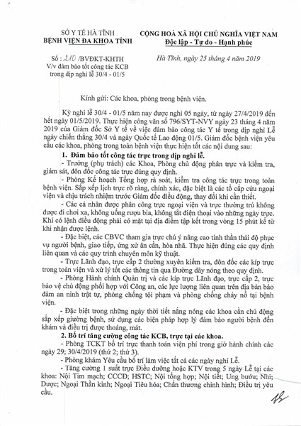 Sáng ngày 26/4/2019, Bệnh viện Đa khoa tỉnh Hà Tĩnh tổ chức quán triệt về việc đảm bảo công tác khám chữa bệnh trong dịp nghỉ lễ Ngày giải phóng miền Nam thống nhất đất nước 30/4 và Ngày quốc tế lao động 01/5.