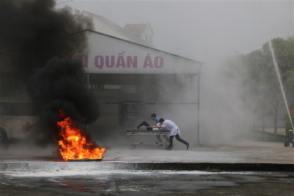 Ngoài ra, Phòng Cảnh sát PCCC&CNCH phối hợp với Bệnh viện Đa khoa tỉnh Hà Tĩnh đã tổ chức diễn tập phương án PCCC&CNCH. Tình huống giả định xảy ra cháy lớn, nhân viên của Bệnh viện đã gọi điện báo cháy cho lực lượng chữa cháy chuyên nghiệp, Ban lãnh đạo Bệnh viện đã chỉ đạo nhân viên vận chuyển bệnh nhân, sơ tán tài sản và thực hiện các phương án tại chỗ ban đầu... Do có sự chuẩn bị chu đáo, trách nhiệm cao của mỗi hóc viên, cùng với sự hướng dẫn nhiệt tình, chu đáo và phối hợp nhịp nhàng của lực lượng PCCC&CNCH chuyên nghiệp, đám cháy đã được dập tắt, bảo vệ an toàn về con người và tài sản của Bệnh viện, buổi diễn tập diễn ra an toàn, thành công.