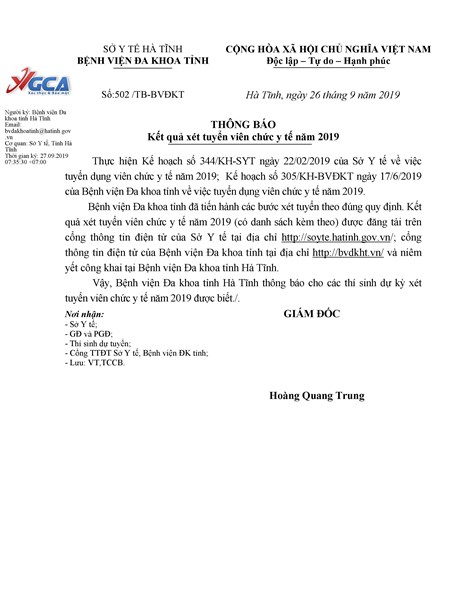 Thực hiện Kế hoạch số 344/KH-SYT ngày 22/02/2019 của Sở Y tế về việc tuyển dụng viên chức y tế năm 2019; Kế hoạch số 305/KH-BVĐKT ngày 17/6/2019 của Bệnh viện Đa khoa tỉnh về việc tuyển dụng viên chức y tế năm 2019. Bệnh viện Đa khoa tỉnh đã tiến hành các bước xét tuyển theo đúng quy định. Kết quả cụ thể như sau: