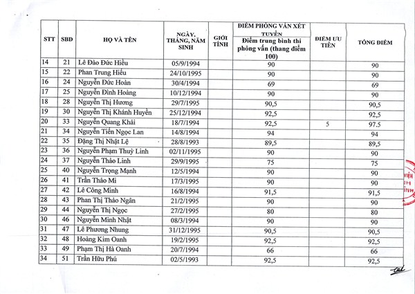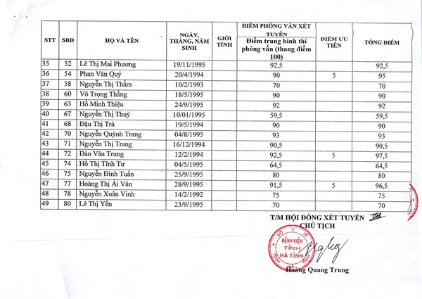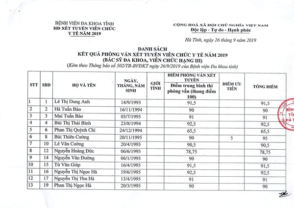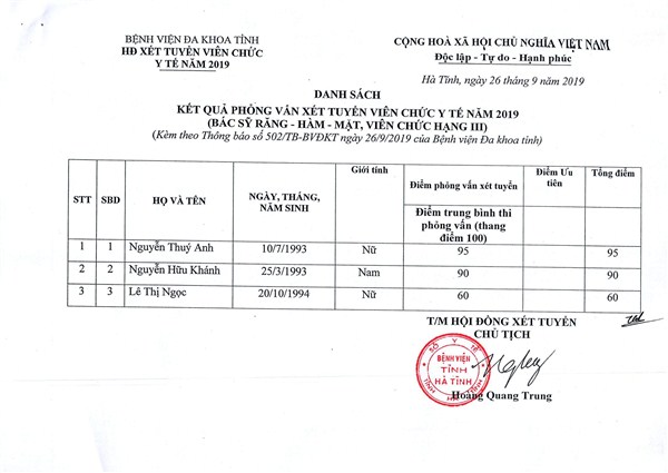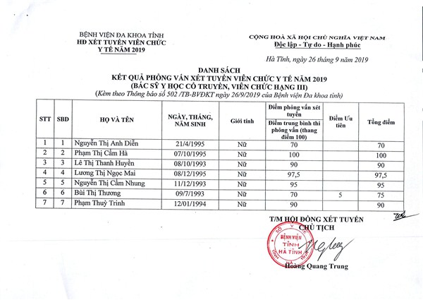 Kết quả phỏng vấn xét tuyển viên chức y tế năm 2019: