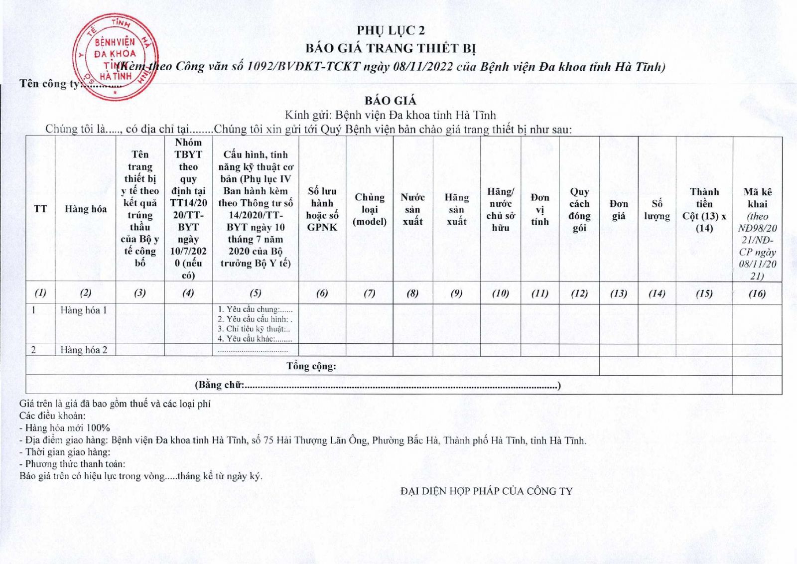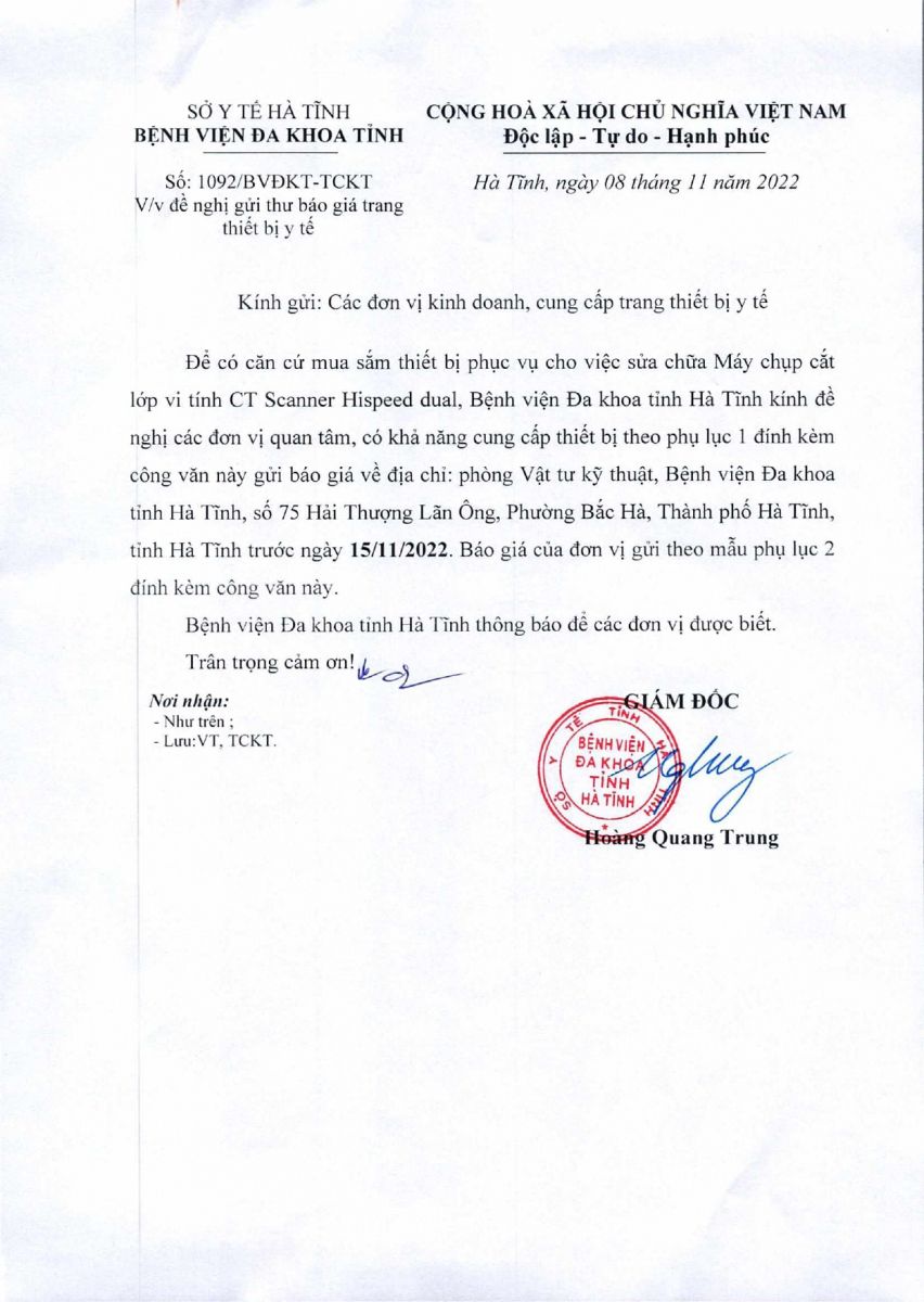Kính đề nghị các đơn vị quan tâm, có khả năng cung cấp trang thiết bị theo danh sách gửi báo giá về địa chỉ: Bệnh viện Đa khoa tỉnh Hà Tĩnh, Số 75, đường Hải Thượng Lãn Ông, phường Bắc Hà, thành phố Hà Tĩnh, tỉnh Hà Tĩnh trước ngày 15/11/2022.