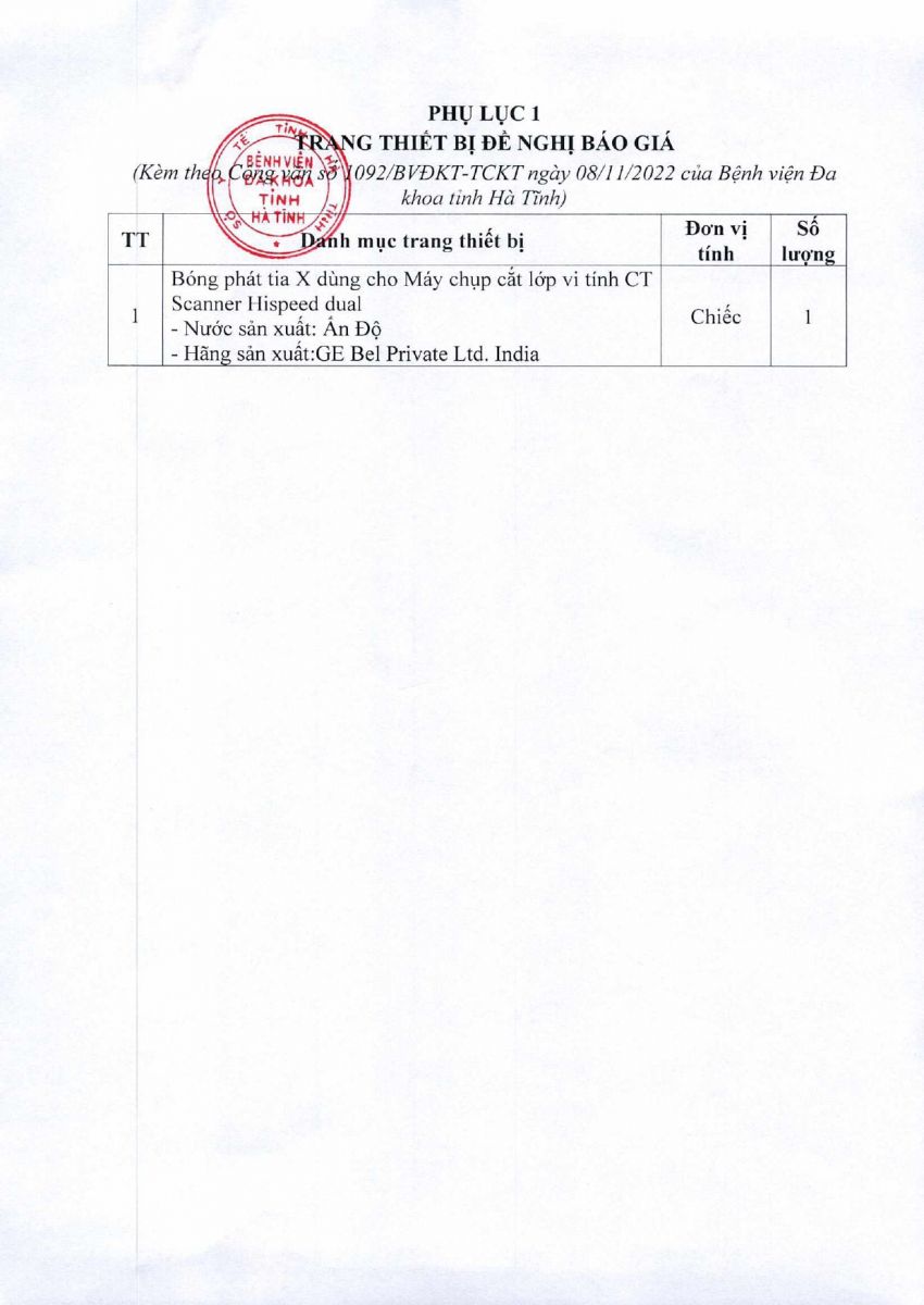 Để có căn cứ mua sắm thiết bị phục vụ cho việc sữa chữa Máy chụp cắt lớp vi tính CT Scanner Hispeed dual, Bệnh viện Đa khoa tỉnh Hà Tĩnh kính đề nghị các đơn vị quan tâm, có khả năng cung cấp trang thiết bị báo giá gửi báo giá cho bệnh viện
