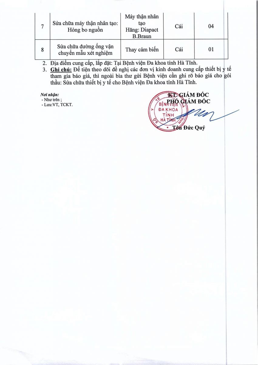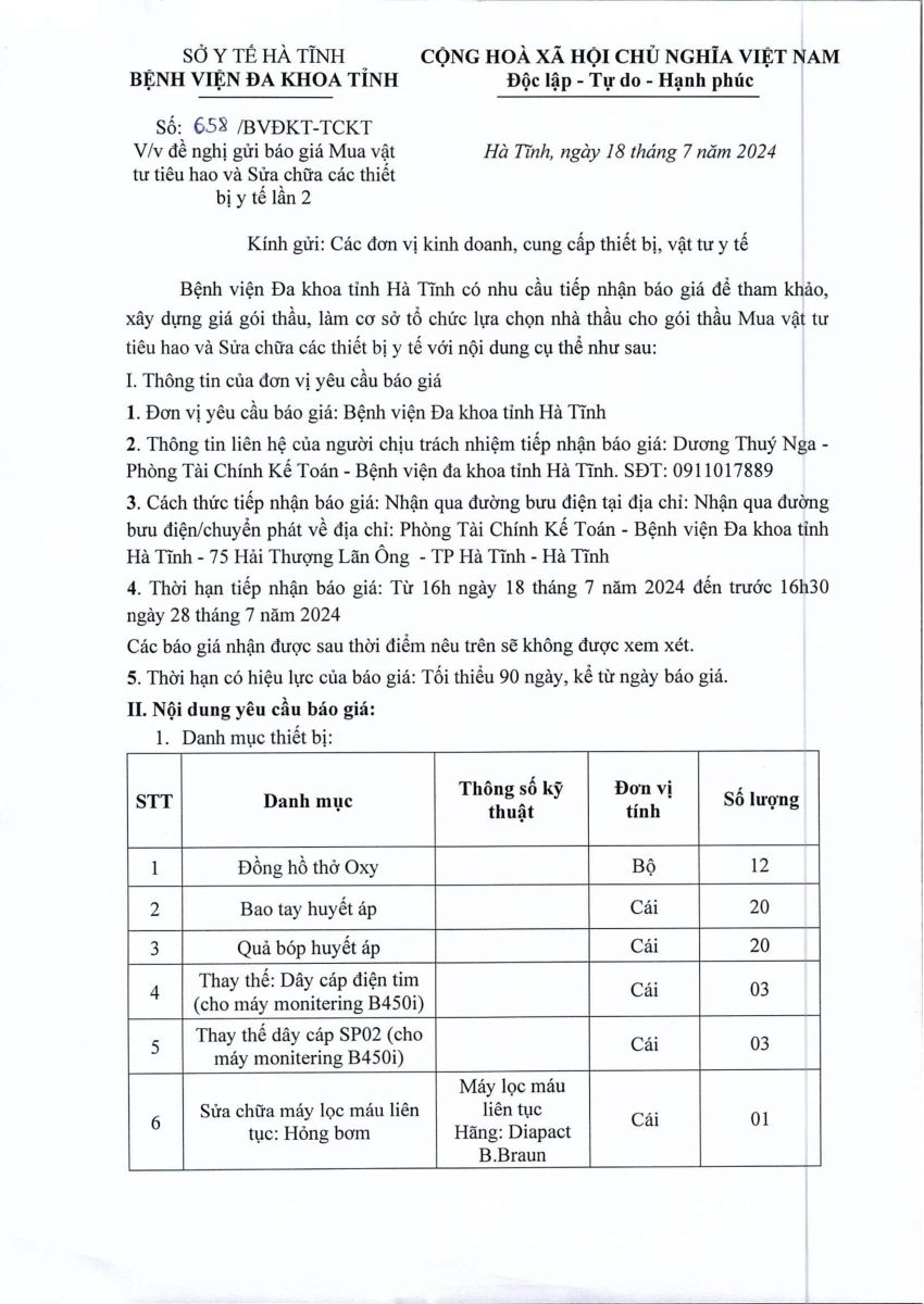 Bệnh viện đa khoa tỉnh Hà Tĩnh có nhu cầu tiếp nhận Báo giá để tham khảo, xây dựng giá gói thầu làm cơ sở tổ chức lựa chọn nhà thầu cho gói thầu Mua vật tư tiêu hao và Sửa chữa các thiết bị y tế, cụ thể như sau: