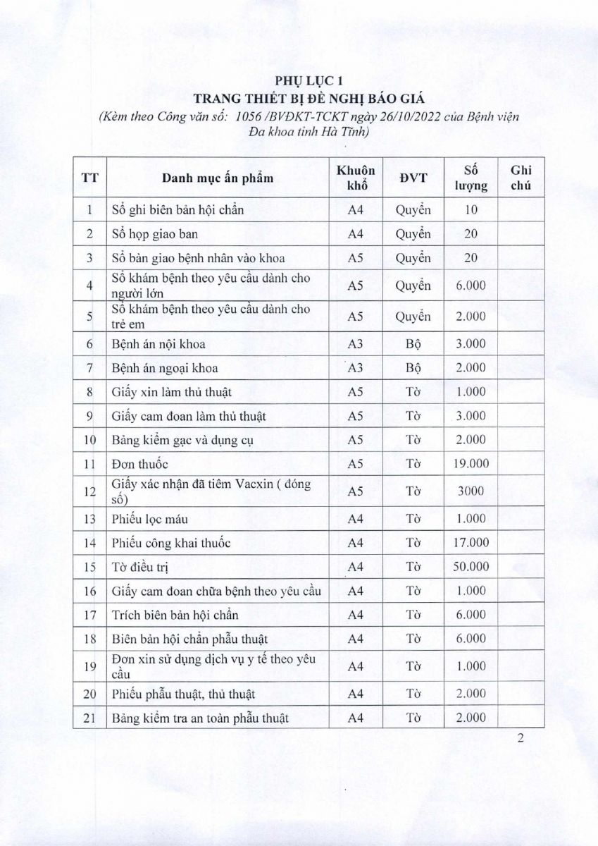 Để có căn cứ mua sắm các ấn phẩm phục vụ cho hoạt động của Bệnh viện năm 2022. Bệnh viện Đa khoa tỉnh Hà Tĩnh kính đề nghị các đơn vị quan tâm, có khả năng cung cấp trang thiết bị báo giá gửi báo giá cho bệnh viện