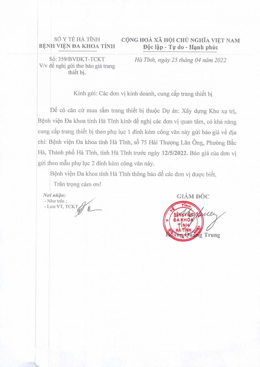 Kính đề nghị các đơn vị quan tâm, có khả năng cung cấp trang thiết bị theo danh sách gửi báo giá về địa chỉ: Bệnh viện Đa khoa tỉnh Hà Tĩnh, Số 75, đường Hải Thượng Lãn Ông, phường Bắc Hà, thành phố Hà Tĩnh, tỉnh Hà Tĩnh trước ngày 05/05/2022.
