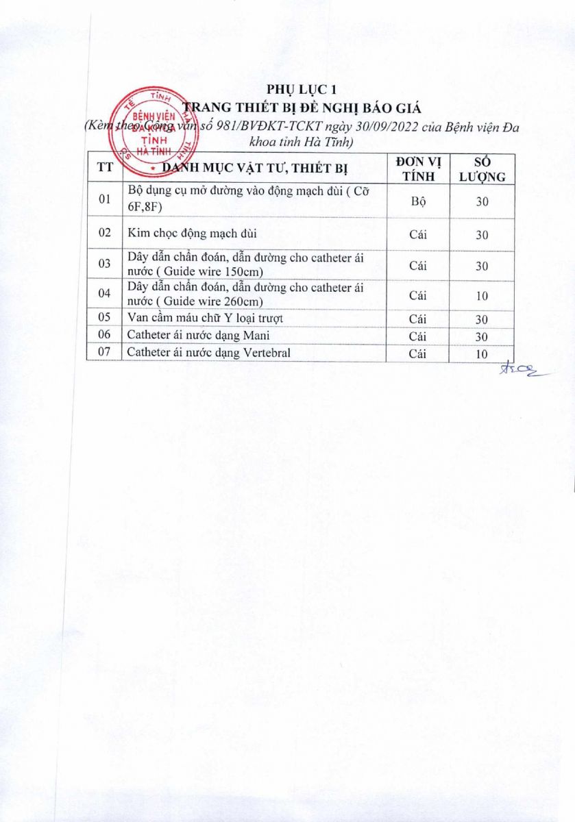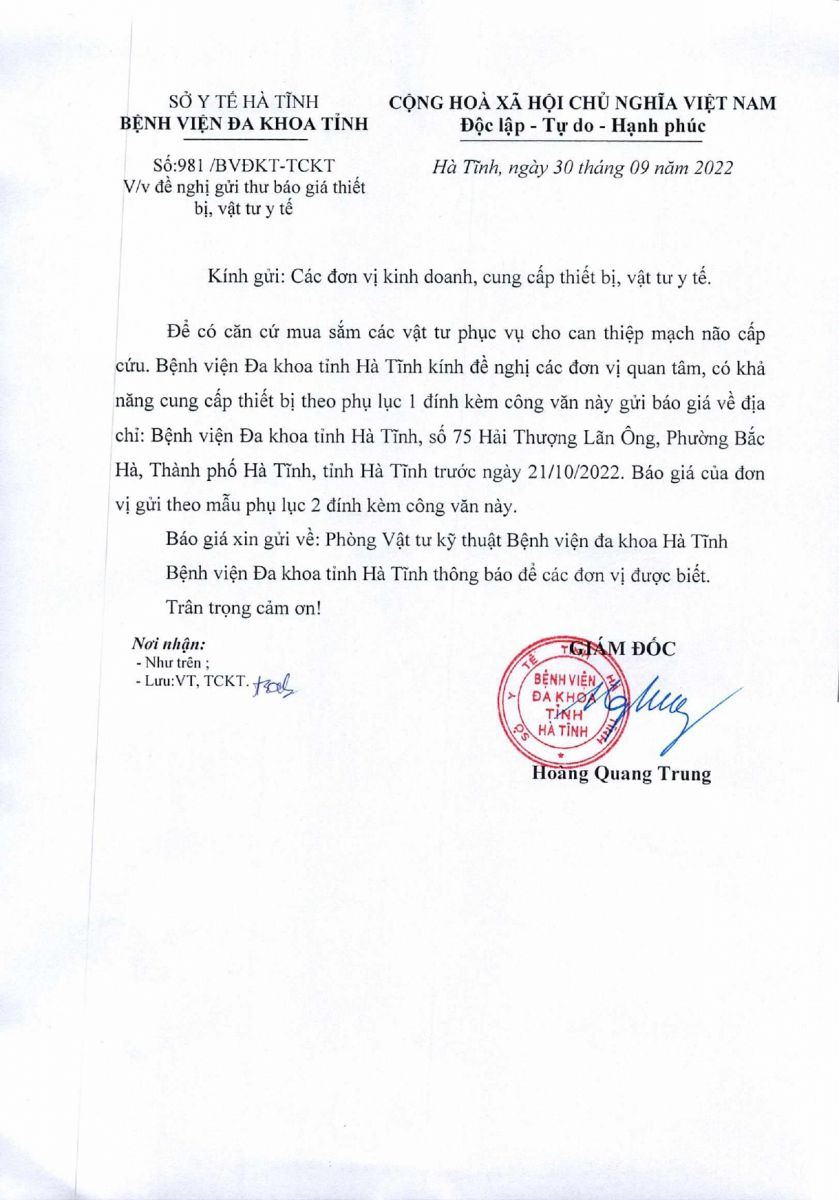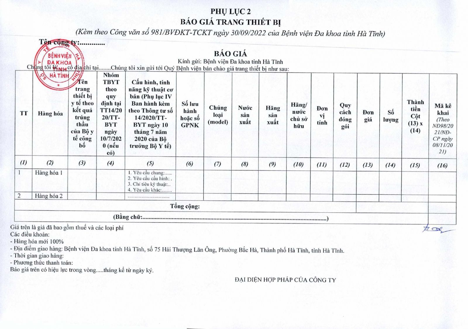 Kính đề nghị các đơn vị quan tâm, có khả năng cung cấp trang thiết bị theo danh sách gửi báo giá về địa chỉ: Bệnh viện Đa khoa tỉnh Hà Tĩnh, Số 75, đường Hải Thượng Lãn Ông, phường Bắc Hà, thành phố Hà Tĩnh, tỉnh Hà Tĩnh trước ngày 21/10/2022.