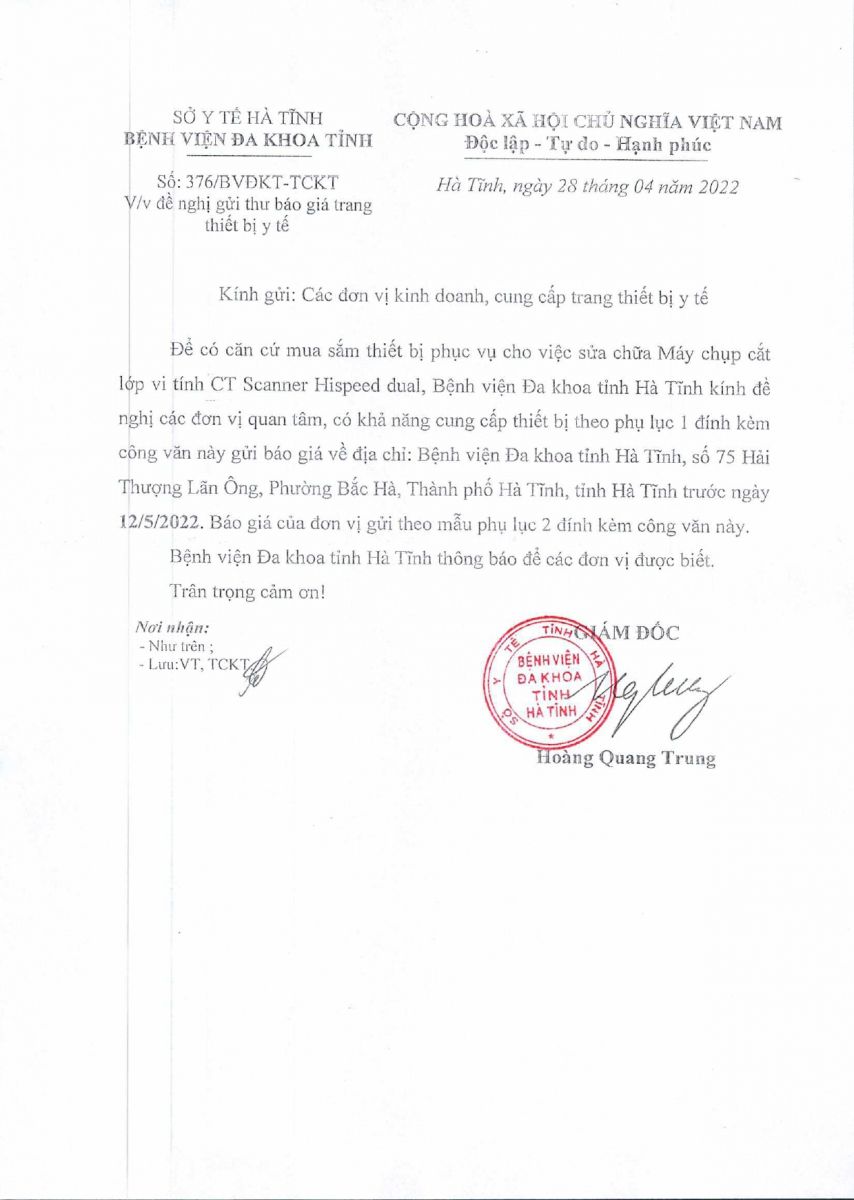 Để có căn cứ mua sắm trang thiết bị phục vụ việc sửa chữa máy Chụp cắt lớp vi tính, Bệnh viện Đa khoa tỉnh Hà Tĩnh kính đề nghị các đơn vị quan tâm, có khả năng cung cấp trang thiết bị gửi báo giá về cho Bệnh viện.