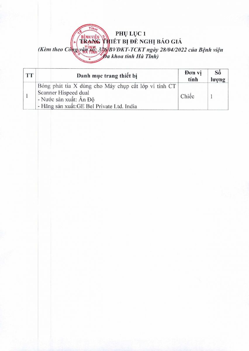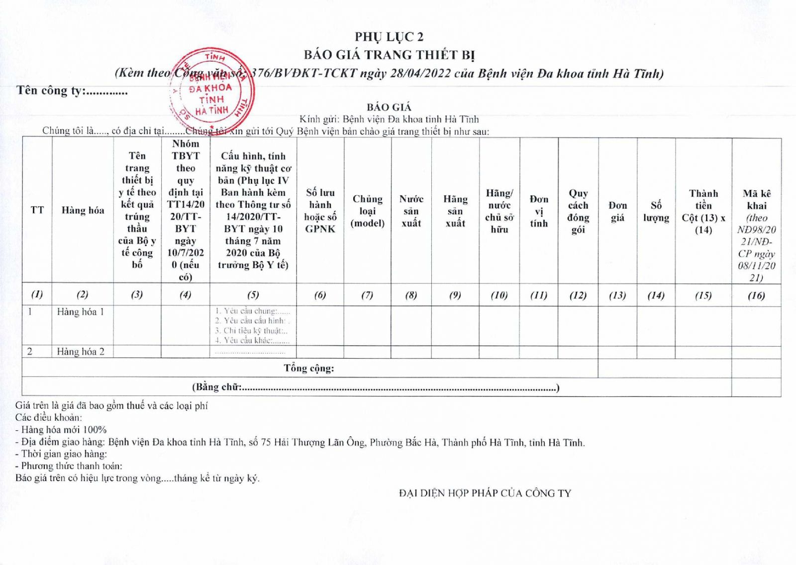 Kính đề nghị các đơn vị quan tâm, có khả năng cung cấp trang thiết bị theo danh sách gửi báo giá về địa chỉ: Bệnh viện Đa khoa tỉnh Hà Tĩnh, Số 75, đường Hải Thượng Lãn Ông, phường Bắc Hà, thành phố Hà Tĩnh, tỉnh Hà Tĩnh trước ngày 12/05/2022.
