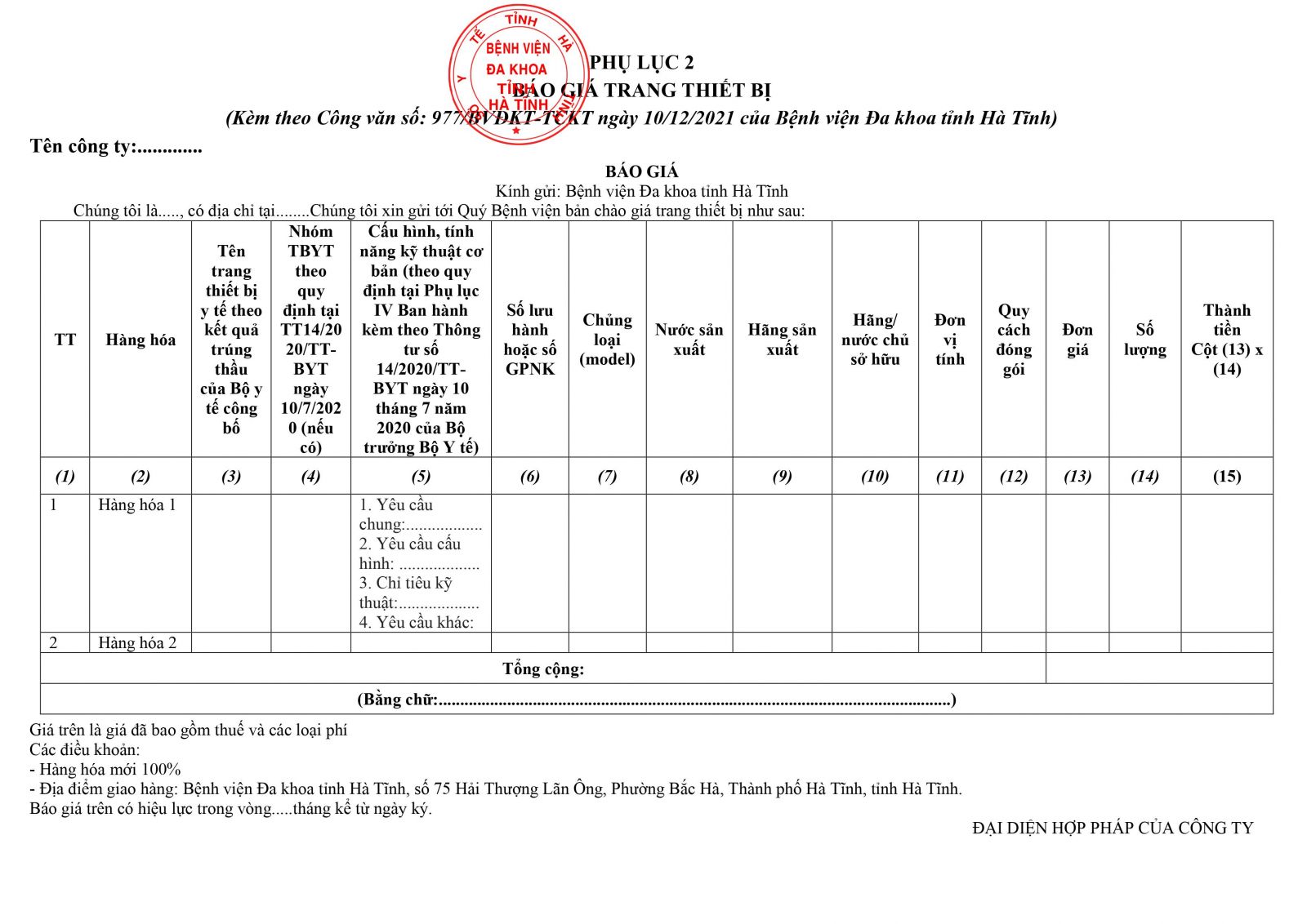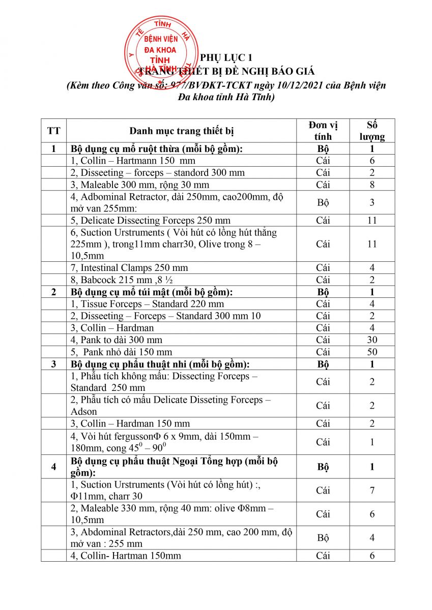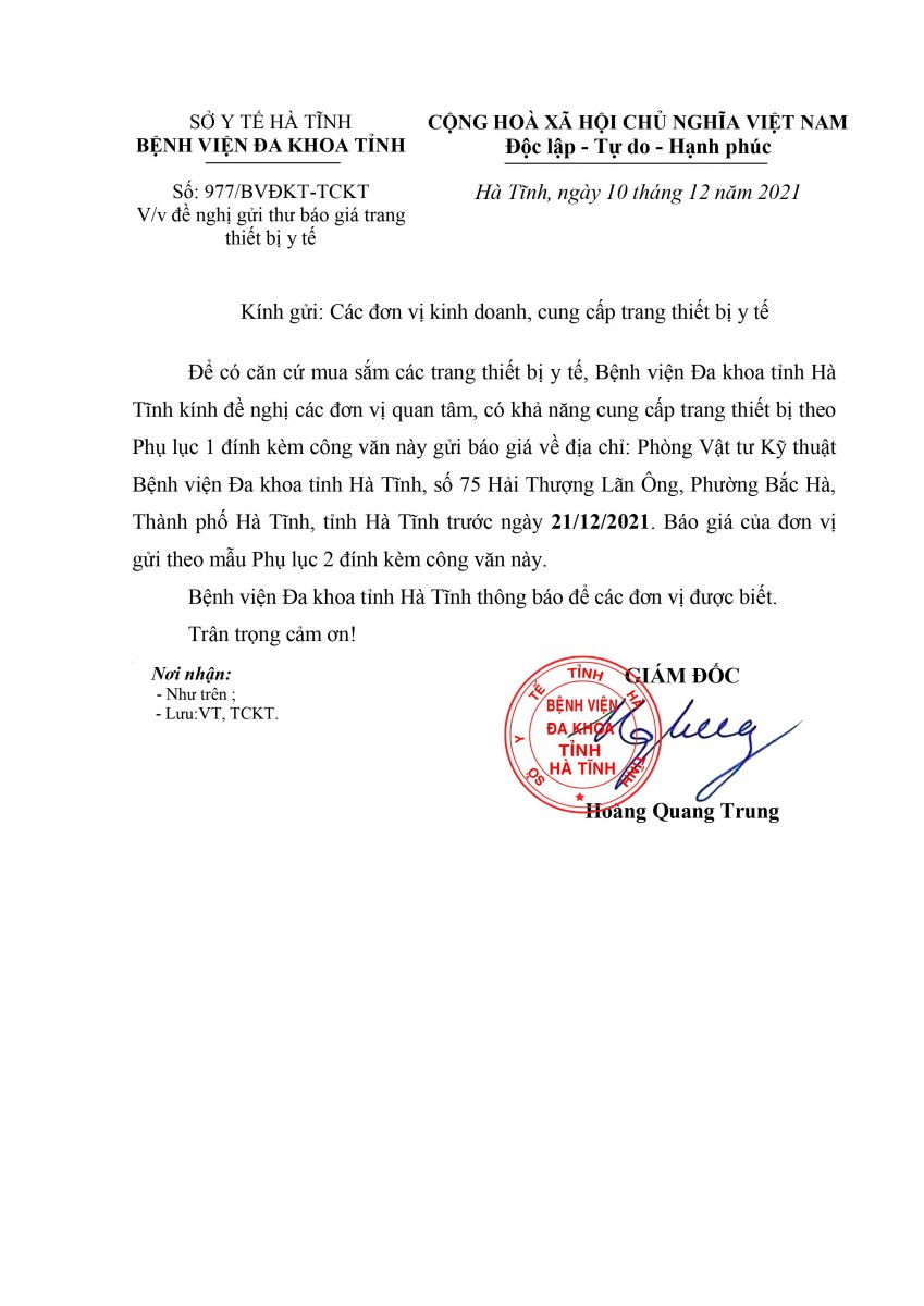 Kính đề nghị các đơn vị quan tâm, có khả năng cung cấp trang thiết bị theo danh sách gửi báo giá về địa chỉ: Bệnh viện Đa khoa tỉnh Hà Tĩnh, Số 75, đường Hải Thượng Lãn Ông, phường Bắc Hà, thành phố Hà Tĩnh, tỉnh Hà Tĩnh trước ngày 21/12/2021.
