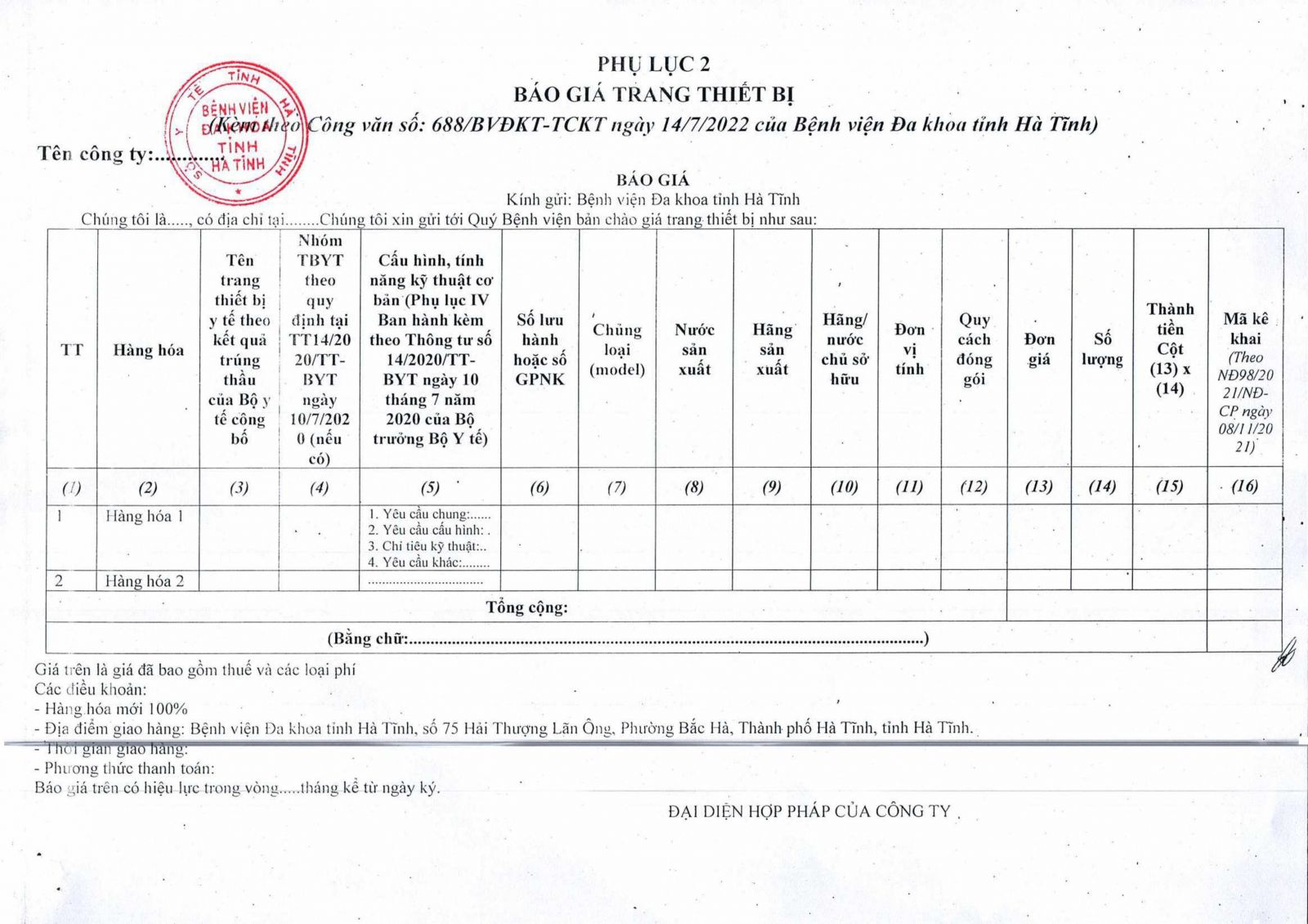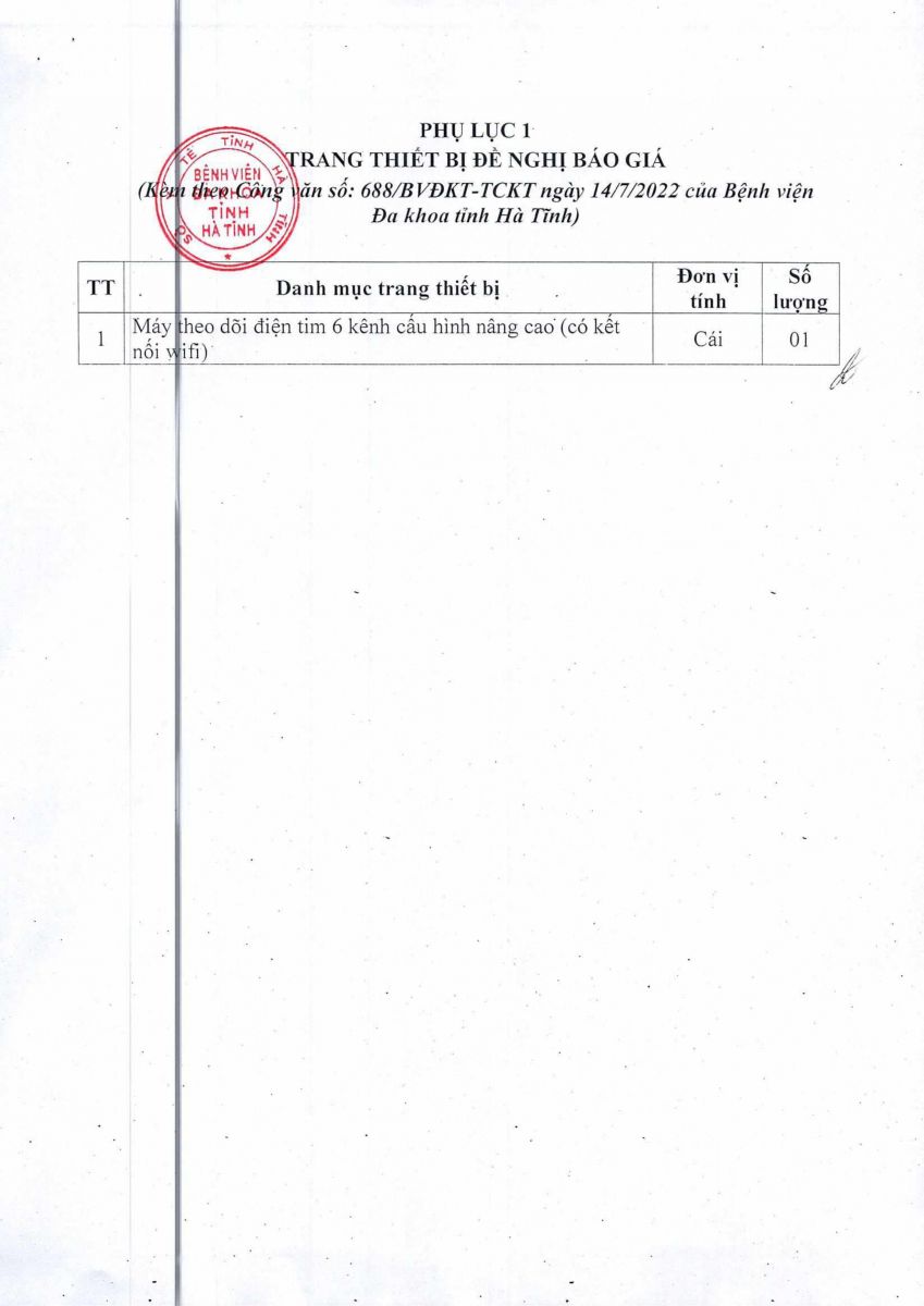 Kính đề nghị các đơn vị quan tâm, có khả năng cung cấp trang thiết bị theo danh sách gửi báo giá về địa chỉ: Bệnh viện Đa khoa tỉnh Hà Tĩnh, Số 75, đường Hải Thượng Lãn Ông, phường Bắc Hà, thành phố Hà Tĩnh, tỉnh Hà Tĩnh trước ngày 26/07/2022.