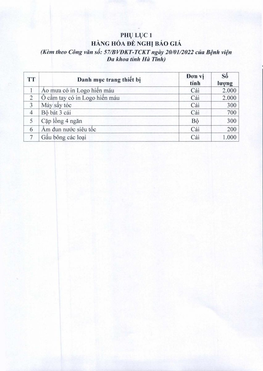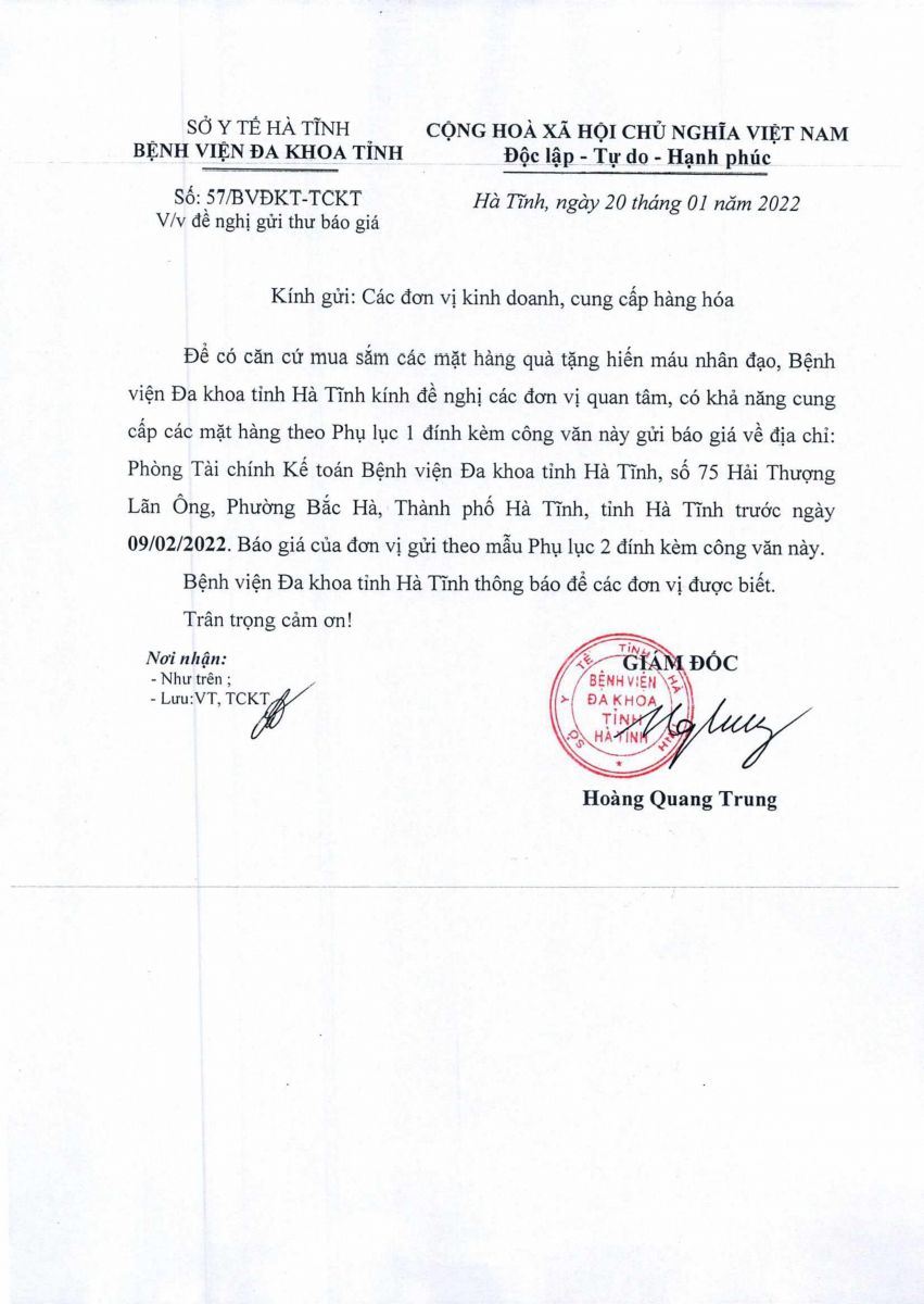 Để có căn cứ mua sắm các mặt hàng quà tặng hiến máu nhân đạo, Bệnh viện Đa khoa tỉnh Hà Tĩnh kính đề nghị các đơn vị quan tâm gửi báo giá về cho Bệnh viện.
