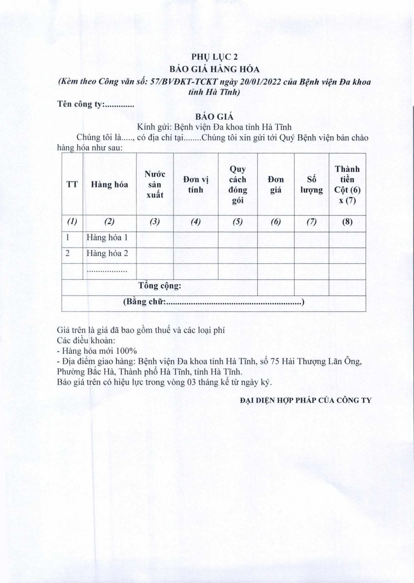 Kính đề nghị các đơn vị quan tâm gửi báo giá về địa chỉ: Bệnh viện Đa khoa tỉnh Hà Tĩnh, Số 75, đường Hải Thượng Lãn Ông, phường Bắc Hà, thành phố Hà Tĩnh, tỉnh Hà Tĩnh trước ngày 09/02/2021.