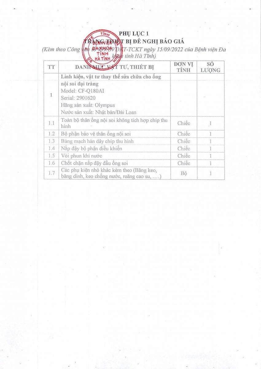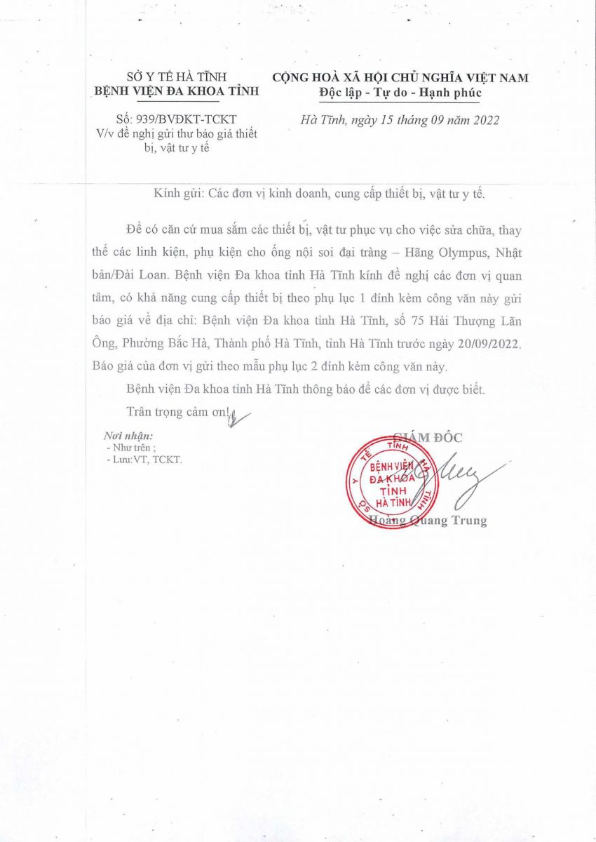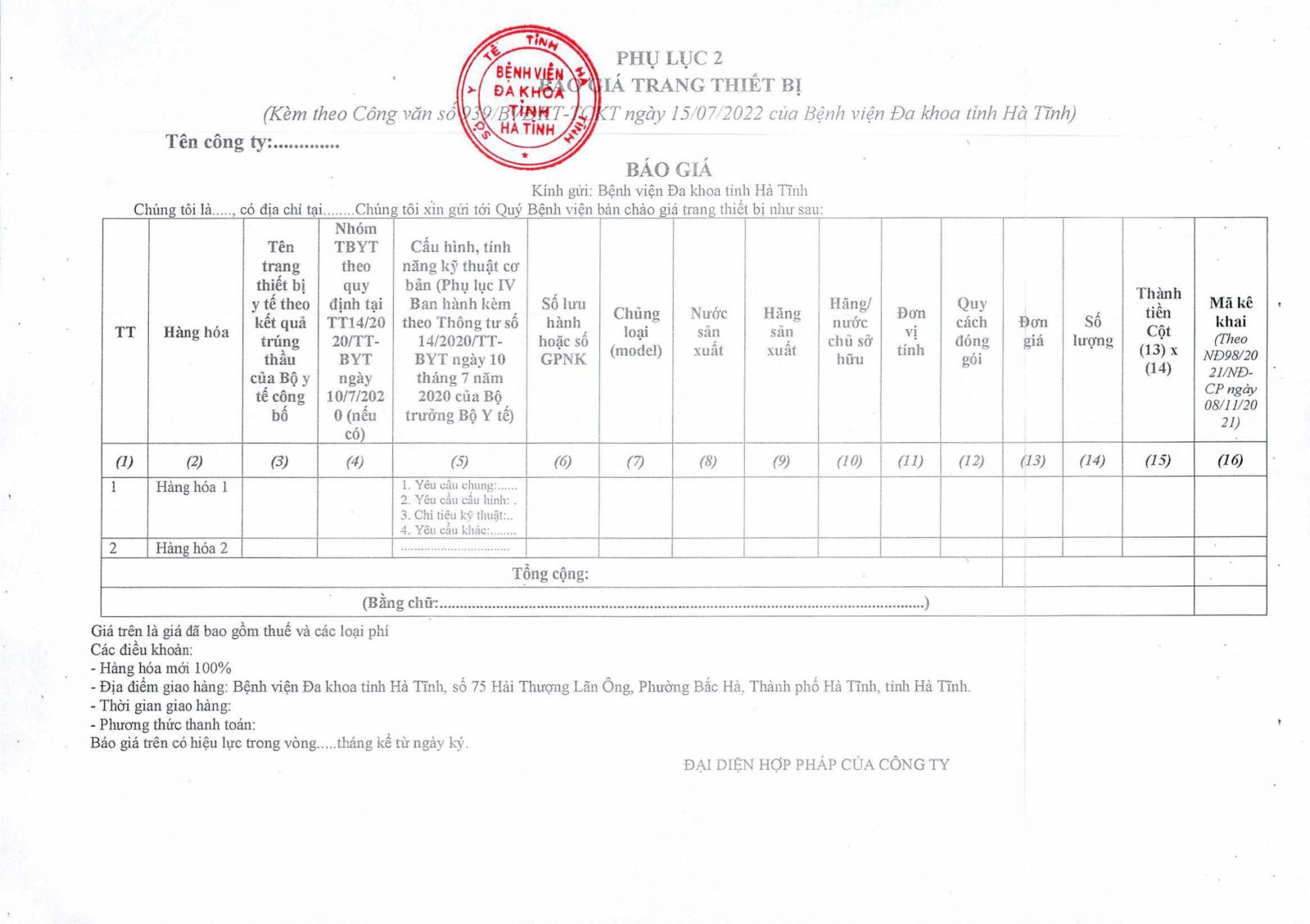 Kính đề nghị các đơn vị quan tâm, có khả năng cung cấp trang thiết bị theo danh sách gửi báo giá về địa chỉ: Bệnh viện Đa khoa tỉnh Hà Tĩnh, Số 75, đường Hải Thượng Lãn Ông, phường Bắc Hà, thành phố Hà Tĩnh, tỉnh Hà Tĩnh trước ngày 20/09/2022.