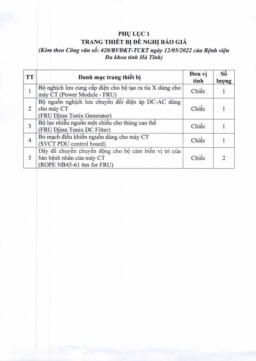 Để có căn cứ mua sắm thiết bị phục vụ cho việc sửa chữa, thay thế các linh kiện cho hệ thống chụp cắt lớp vi tính 16 dãy Revolution ACTs, GE, Ấn Độ. Bệnh viện Đa khoa tỉnh Hà Tĩnh kính đề nghị các đơn vị quan tâm, có khả năng cung cấp thiết bị gửi báo giá về cho Bệnh viện