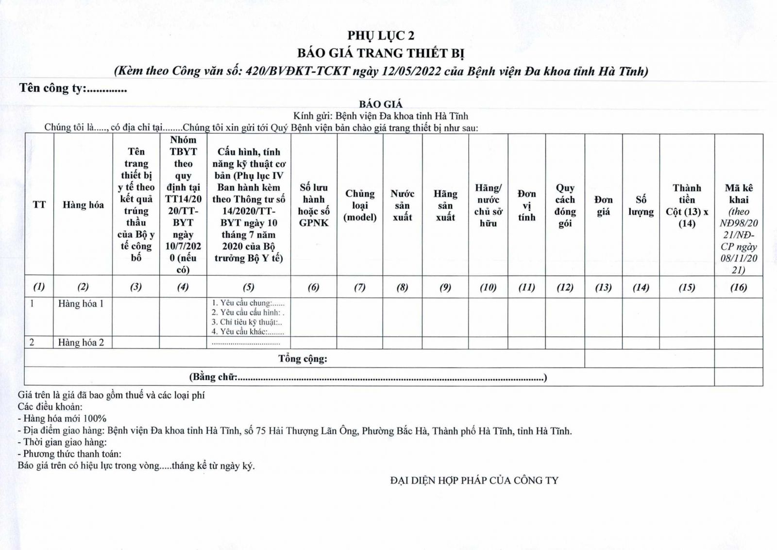Kính đề nghị các đơn vị quan tâm, có khả năng cung cấp trang thiết bị theo danh sách gửi báo giá về địa chỉ: Bệnh viện Đa khoa tỉnh Hà Tĩnh, Số 75, đường Hải Thượng Lãn Ông, phường Bắc Hà, thành phố Hà Tĩnh, tỉnh Hà Tĩnh trước ngày 21/05/2022.
