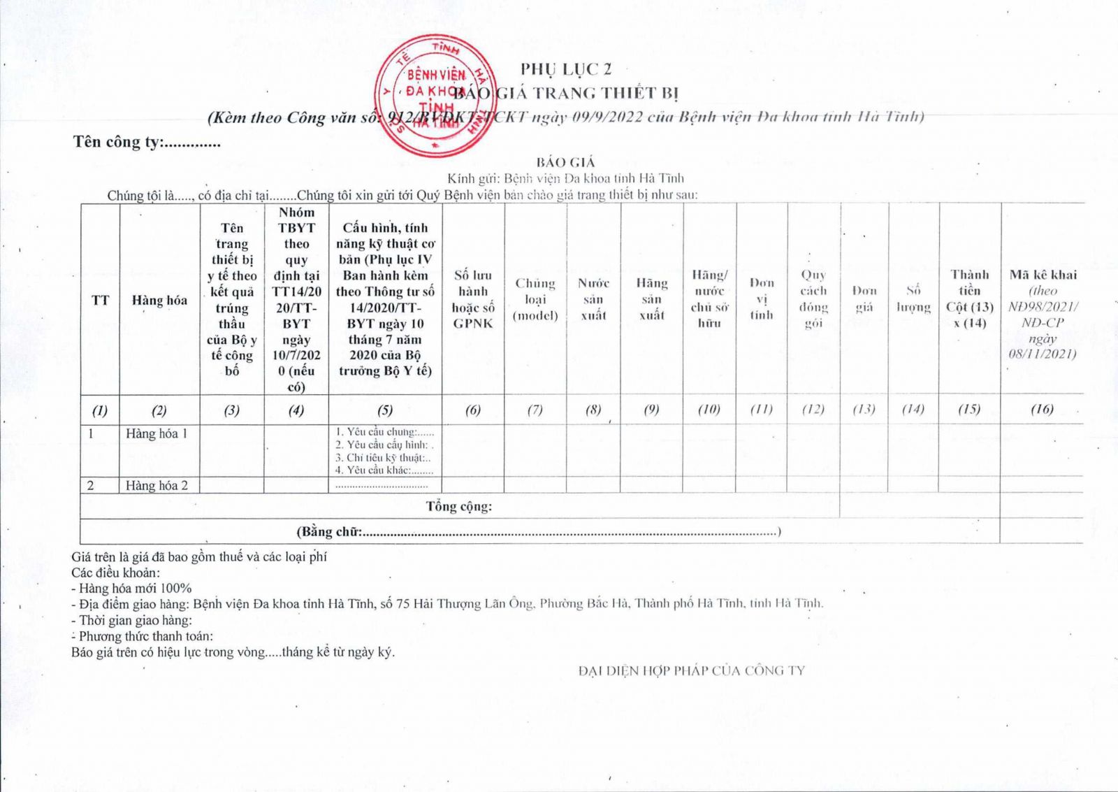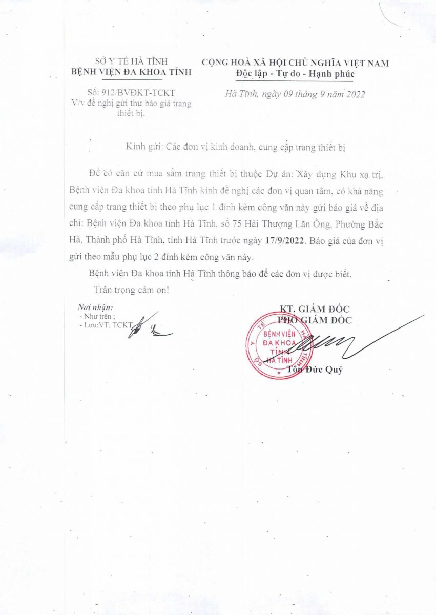 Kính đề nghị các đơn vị quan tâm, có khả năng cung cấp trang thiết bị theo danh sách gửi báo giá về địa chỉ: Bệnh viện Đa khoa tỉnh Hà Tĩnh, Số 75, đường Hải Thượng Lãn Ông, phường Bắc Hà, thành phố Hà Tĩnh, tỉnh Hà Tĩnh trước ngày 17/09/2022.