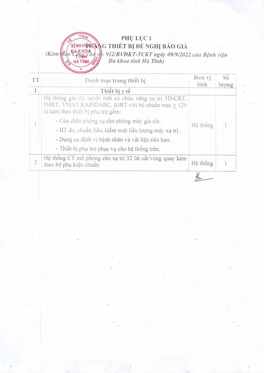 Để có căn cứ mua sắm trang thiết bị thuộc Dự án: Xây dựng khu xạ trị, Bệnh viện Đa khoa tỉnh Hà Tĩnh kính đề nghị các đơn vị quan tâm, có khả năng quan cung cấp trang thiết bị gửi báo giá về cho bệnh viện