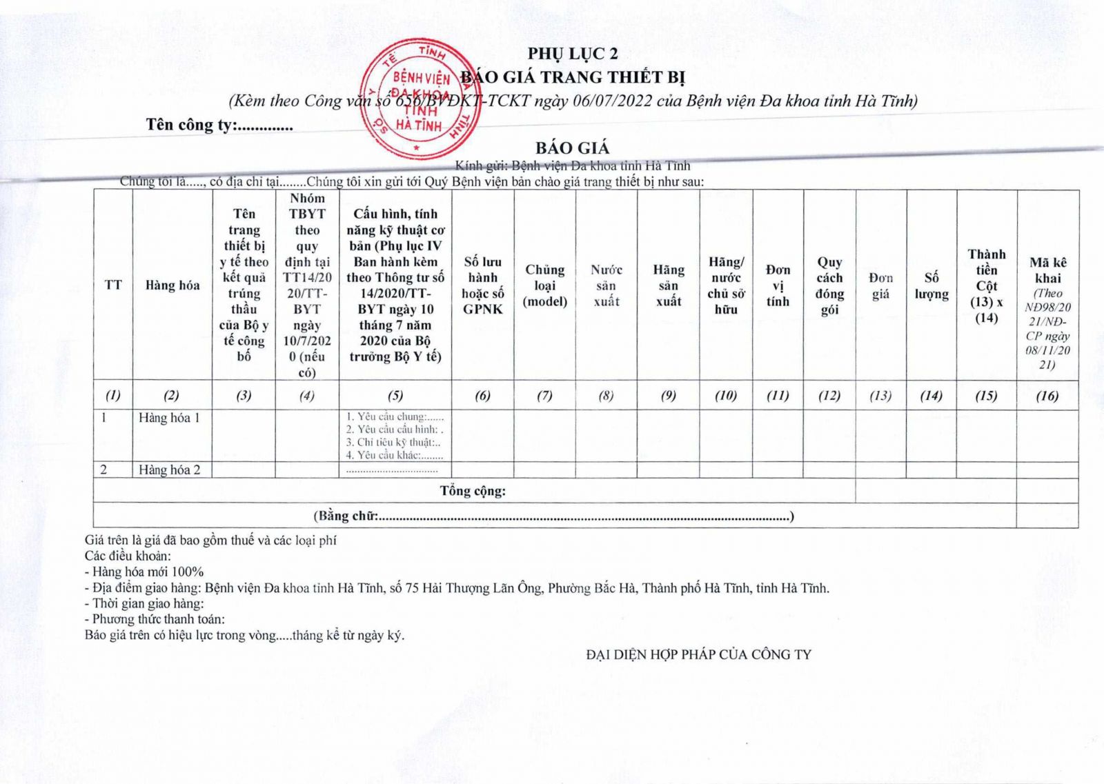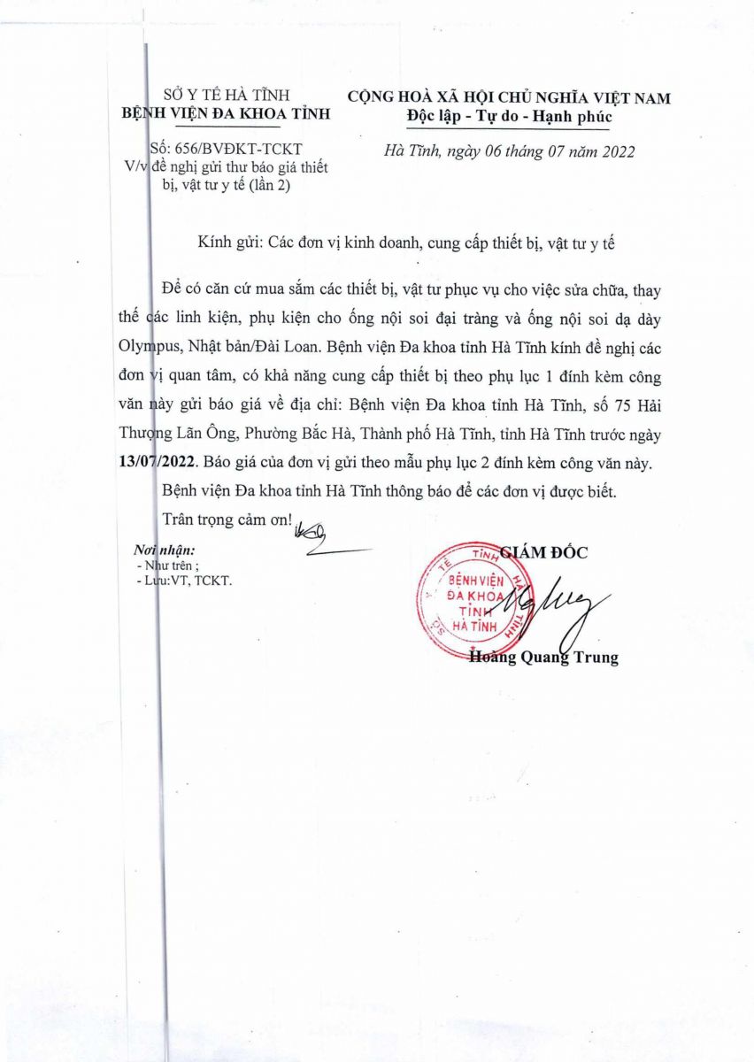 Kính đề nghị các đơn vị quan tâm, có khả năng cung cấp trang thiết bị theo danh sách gửi báo giá về địa chỉ: Bệnh viện Đa khoa tỉnh Hà Tĩnh, Số 75, đường Hải Thượng Lãn Ông, phường Bắc Hà, thành phố Hà Tĩnh, tỉnh Hà Tĩnh trước ngày 13/07/2022.