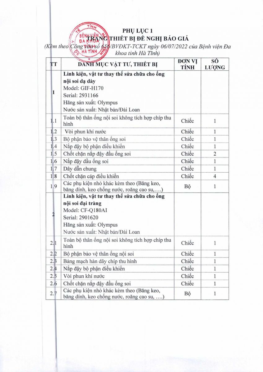 Để có căn cứ mua sắm các thiết bị, vật tư phục vụ cho việc sửa chữa, thay thế các linh kiện, phụ kiện cho ống nội soi đại tràng và ống nội soi dạ dày Olympus, Nhật Bản/Đài Loan. Bệnh viện Đa khoa tỉnh Hà Tĩnh kính đề nghị các đơn vị quan tâm, có khả năng cung cấp trang thiết bị gửi báo giá về cho Bệnh viện.