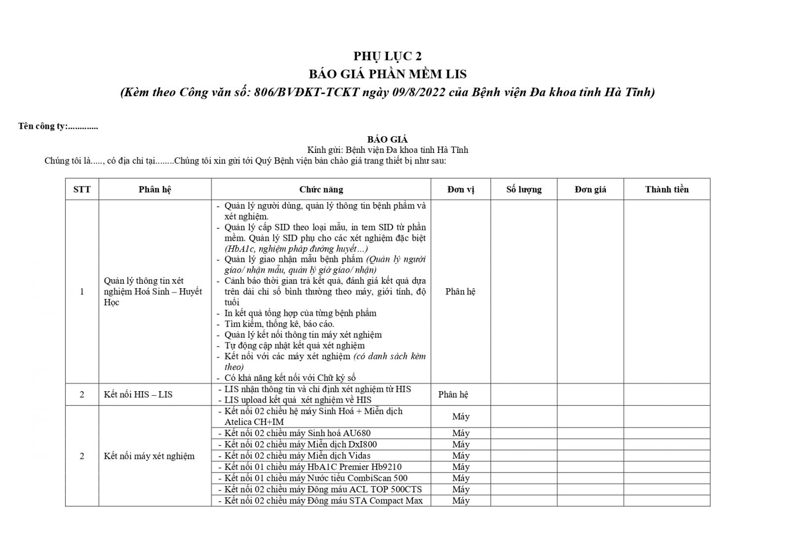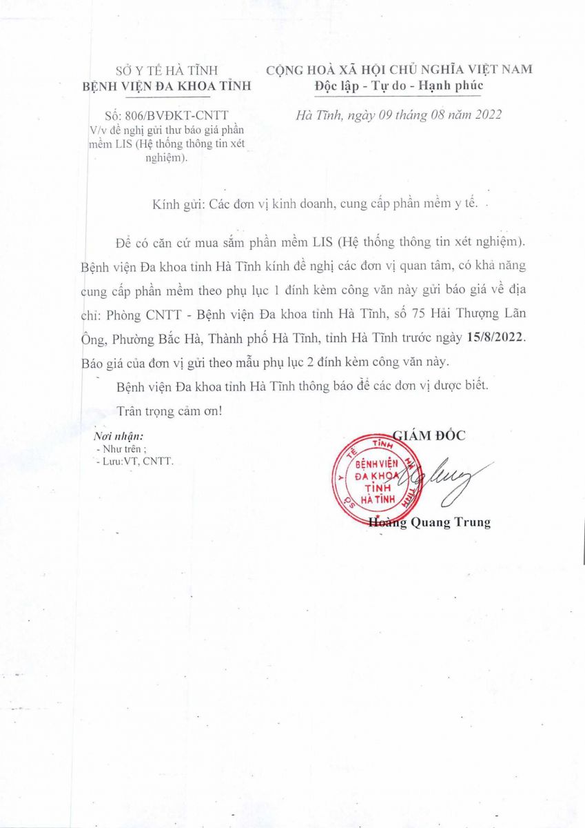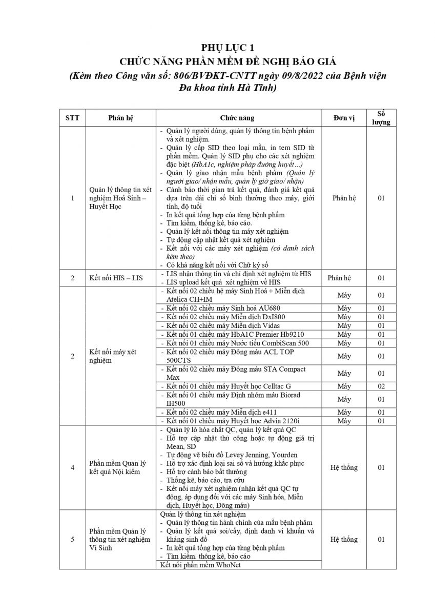 Để có căn cứ mua sắm phần mềm LIS (Hệ thống thông tin xét nghiệm). Bệnh viện Đa khoa tỉnh Hà Tĩnh kính đề nghị các đơn vị quan tâm, có khả năng cung cấp phần mềm gửi báo giá về cho Bệnh viện.
