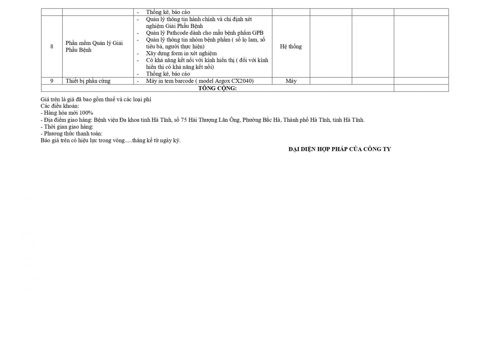 Kính đề nghị các đơn vị quan tâm, có khả năng cung cấp trang thiết bị theo danh sách gửi báo giá về địa chỉ: Bệnh viện Đa khoa tỉnh Hà Tĩnh, Số 75, đường Hải Thượng Lãn Ông, phường Bắc Hà, thành phố Hà Tĩnh, tỉnh Hà Tĩnh trước ngày 15/08/2022.