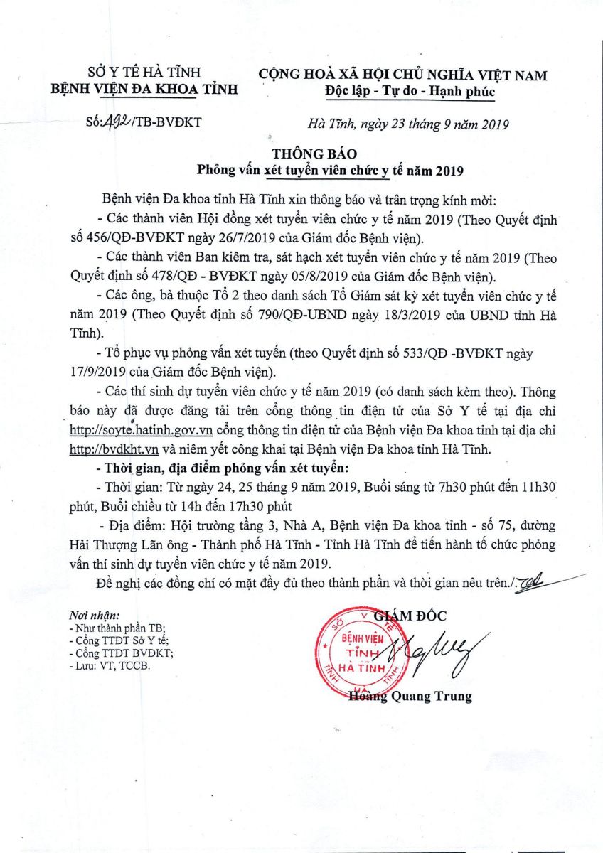 Hội đồng xét tuyển viên chức y tế năm 2019, Bệnh viện Đa khoa tỉnh thông báo xét tuyển thí sinh dự phỏng vấn viên chức y tế năm 2019.