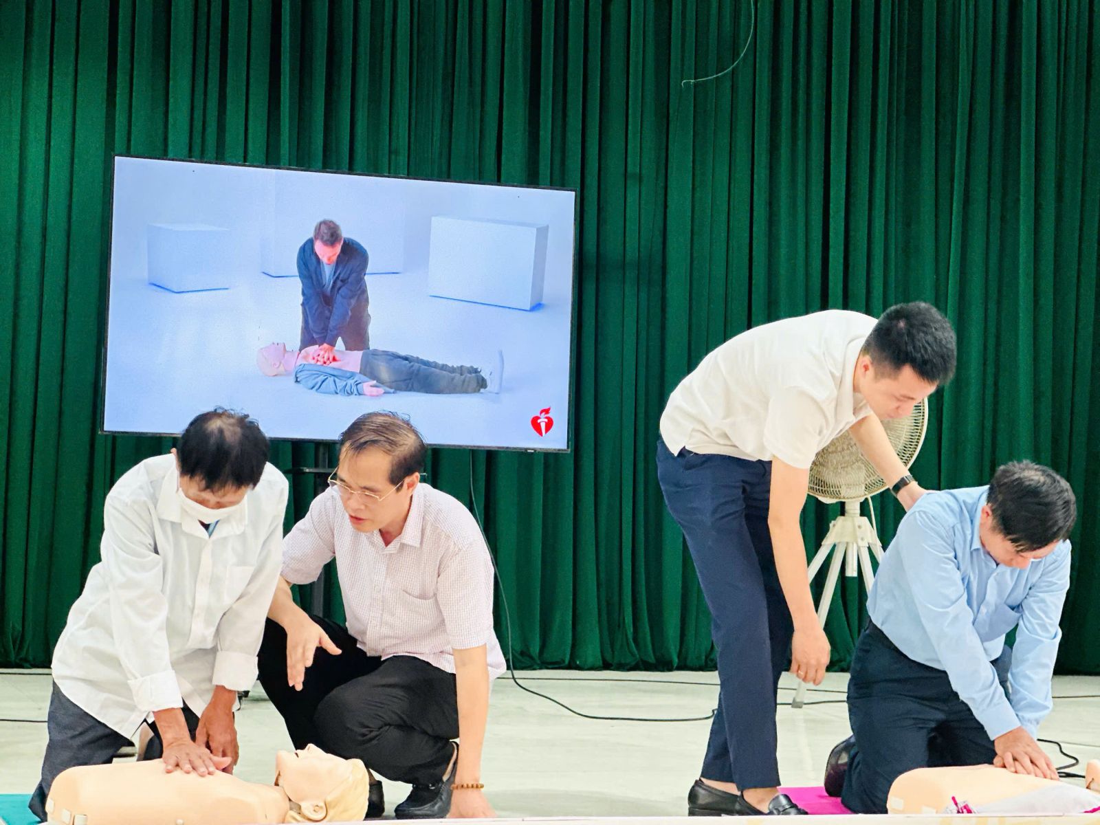 Các học viên thực hành trên mô hình về kỹ năng sơ cứu, ép tim ngoài lồng ngực