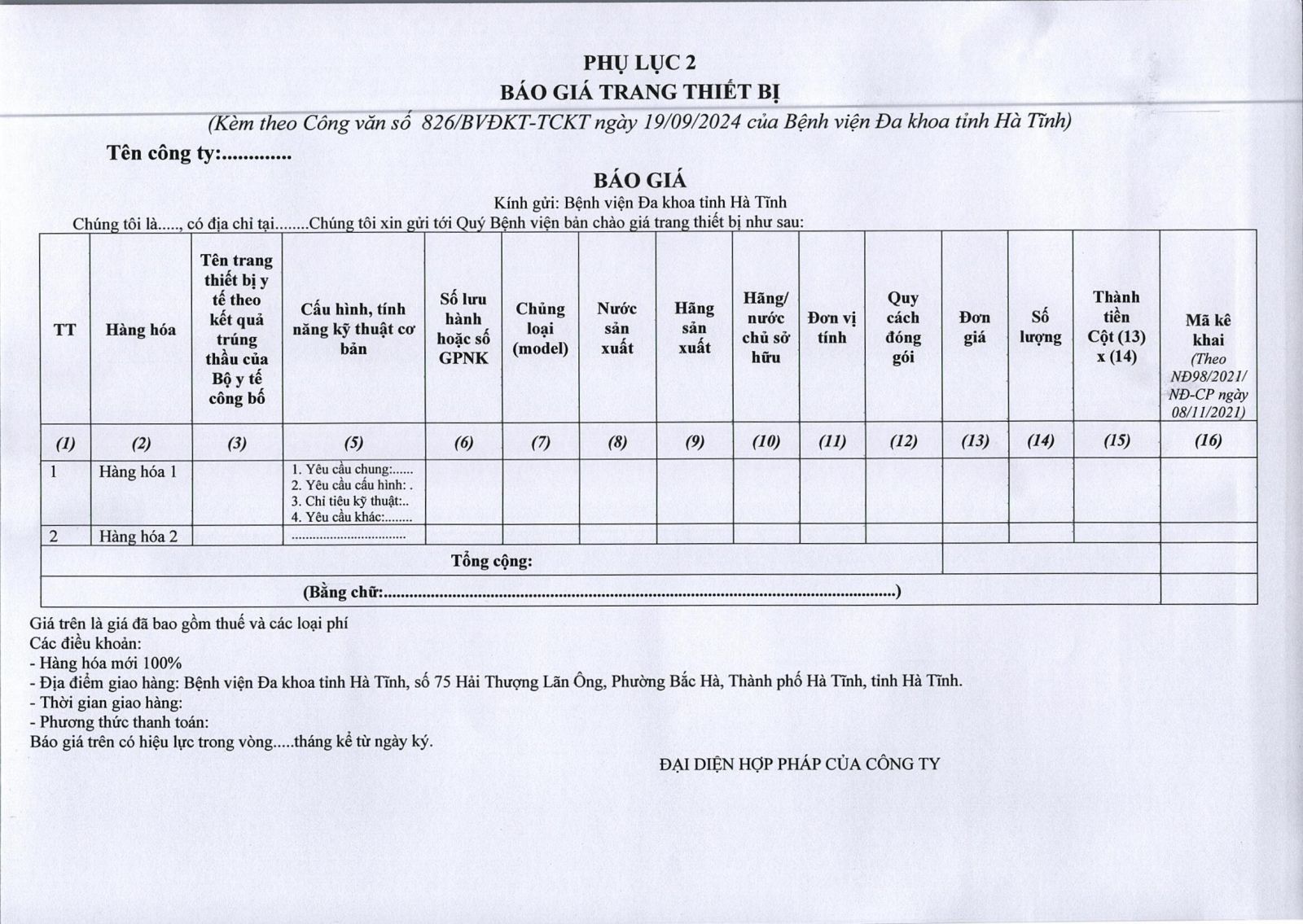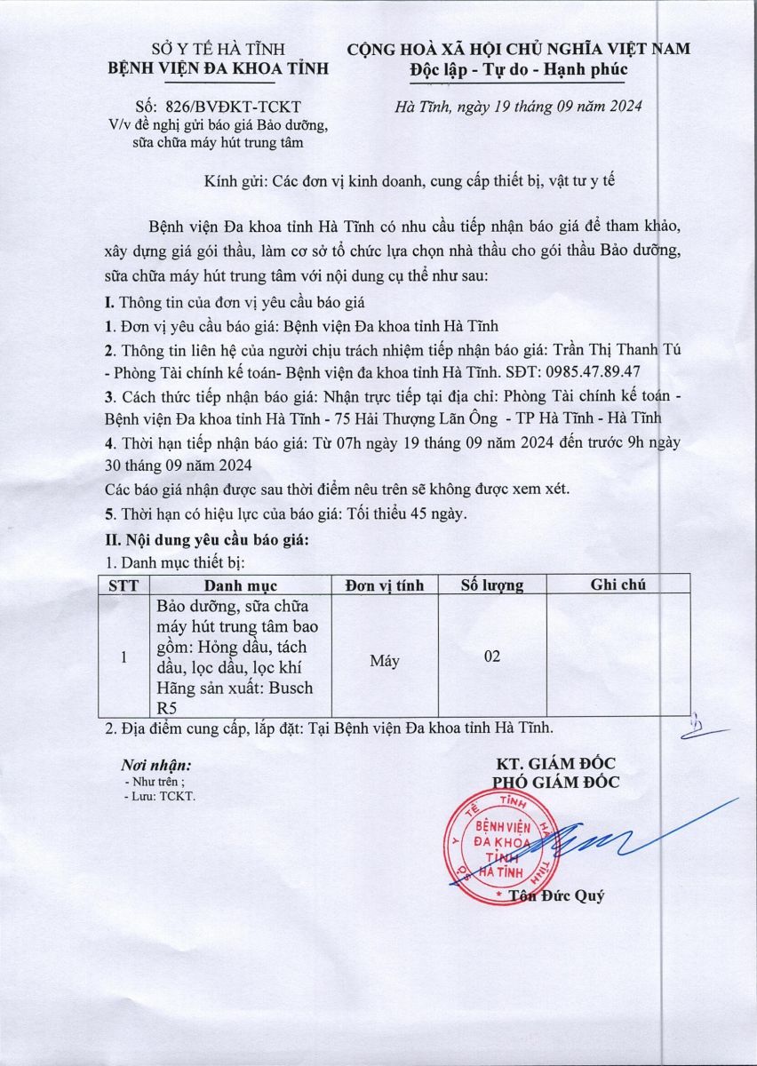 Bệnh viện Đa khoa tỉnh Hà Tĩnh có nhu cầu tiếp nhận báo giá để tham khảo, xây dựng giá gói thầu, làm cơ sở tổ chức lựa chọn nhà thầu cho gói thầu Bảo dưỡng, sữa chữa máy hút trung tâm với nội dung cụ thể như sau: