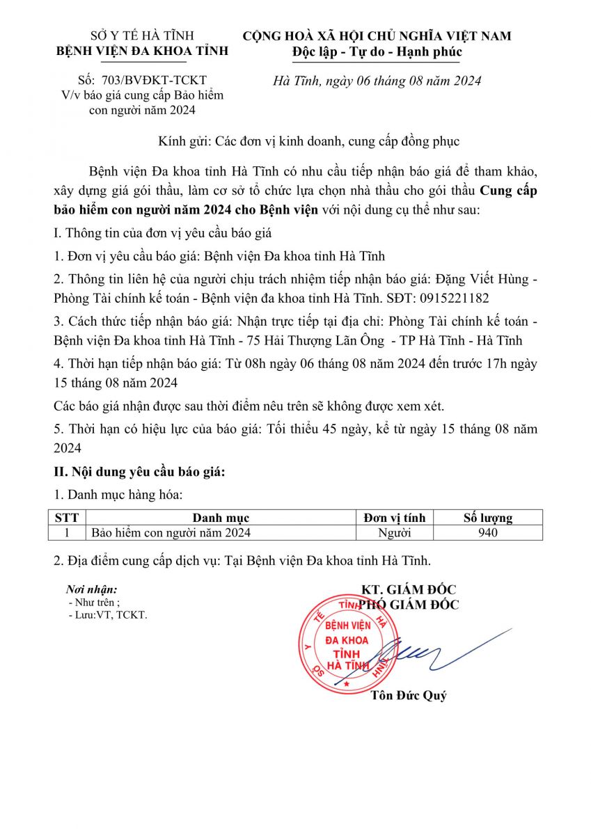 Bệnh viện Đa khoa tỉnh Hà Tĩnh có nhu cầu tiếp nhận báo giá để tham khảo, xây dựng giá gói thầu, làm cơ sở tổ chức lựa chọn nhà thầu cho gói thầu Cung cấp bảo hiểm con người năm 2024 cho Bệnh viện với nội dung cụ thể như sau: