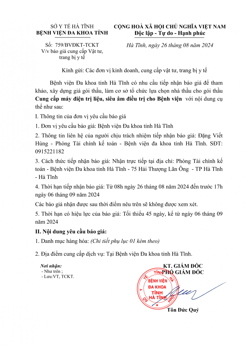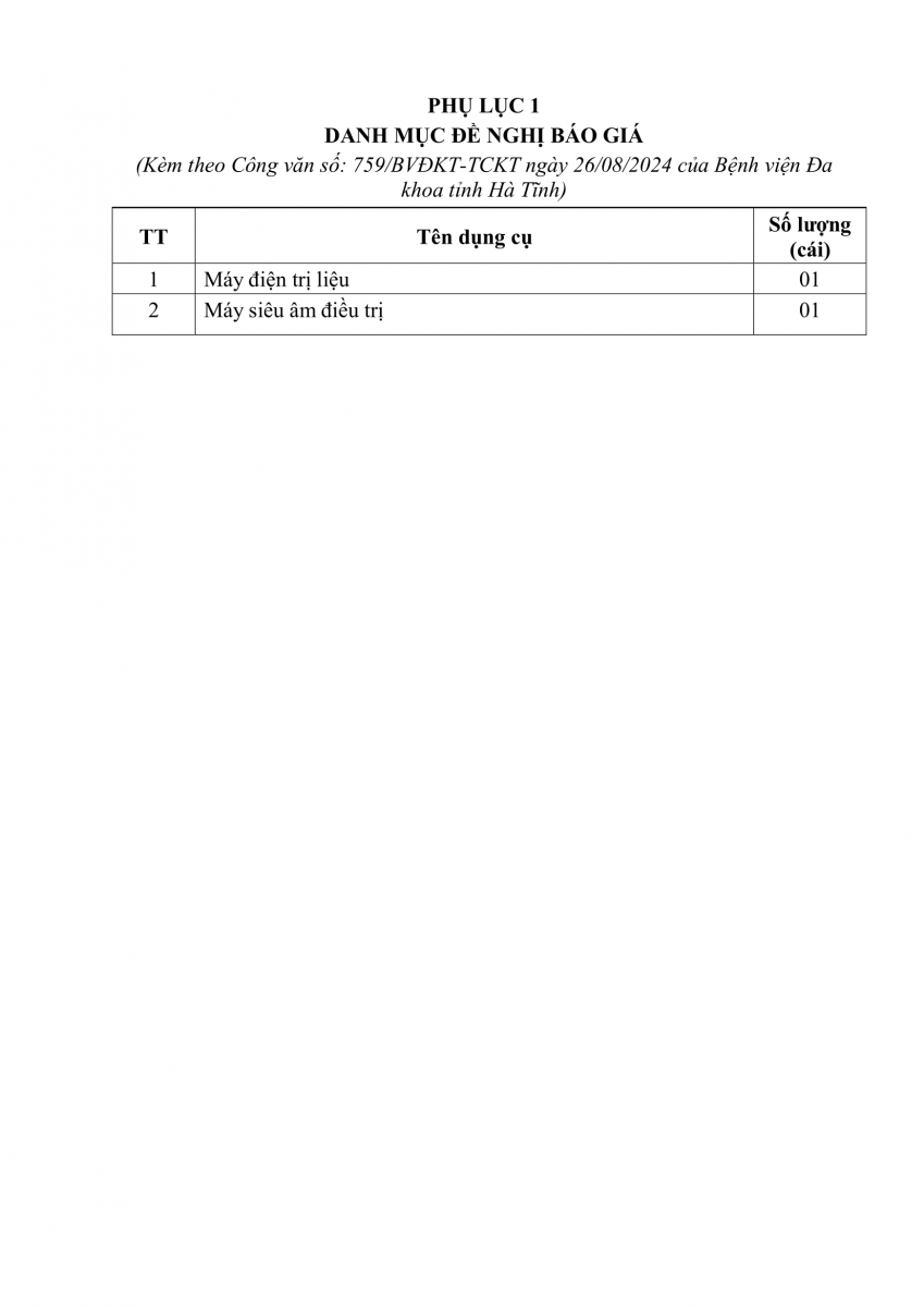Bệnh viện Đa khoa tỉnh Hà Tĩnh có nhu cầu tiếp nhận báo giá để tham khảo, xây dựng giá gói thầu, làm cơ sở tổ chức lựa chọn nhà thầu cho gói thầu Cung cấp máy điện trị liệu, siêu âm điều trị cho Bệnh viện với nội dung cụ thể như sau: