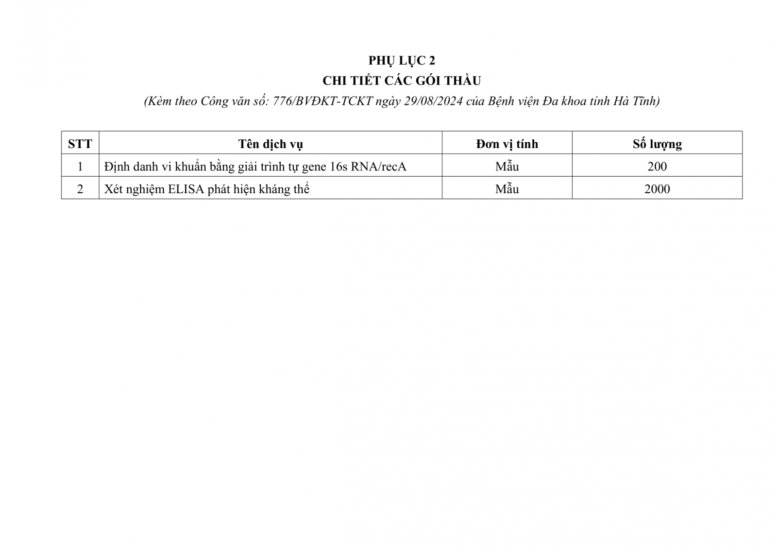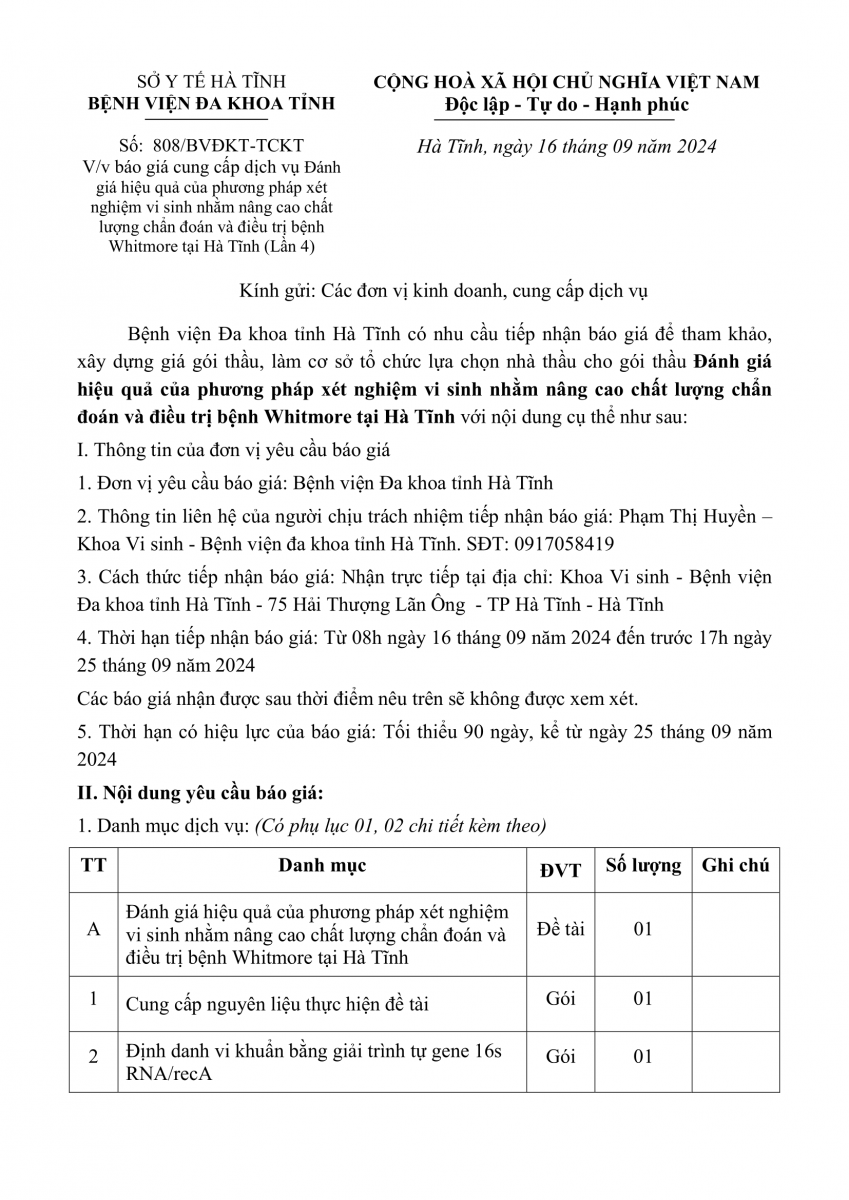 Bệnh viện Đa khoa tỉnh Hà Tĩnh có nhu cầu tiếp nhận báo giá để tham khảo, xây dựng giá gói thầu, làm cơ sở tổ chức lựa chọn nhà thầu cho gói thầu Đánh giá hiệu quả của phương pháp xét nghiệm vi sinh nhằm nâng cao chất lượng chẩn đoán và điều trị bệnh Whitmore tại Hà Tĩnh với nội dung cụ thể như sau: