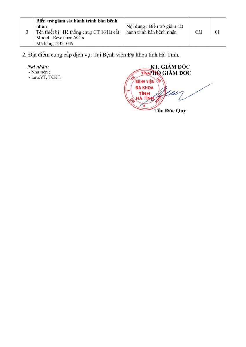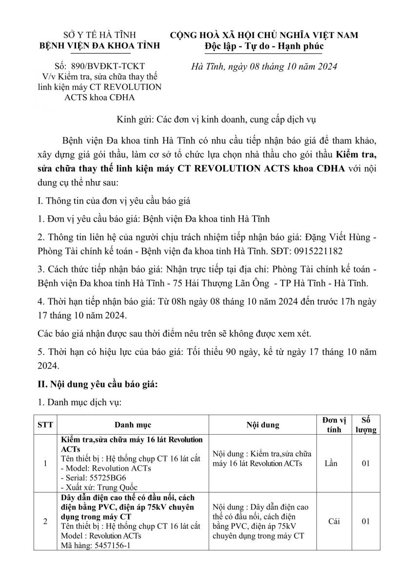 Bệnh viện Đa khoa tỉnh Hà Tĩnh có nhu cầu tiếp nhận báo giá để tham khảo, xây dựng giá gói thầu, làm cơ sở tổ chức lựa chọn nhà thầu cho gói thầu Kiểm tra, sửa chữa thay thế linh kiện máy CT REVOLUTION ACTS khoa CĐHA với nội dung cụ thể như sau: