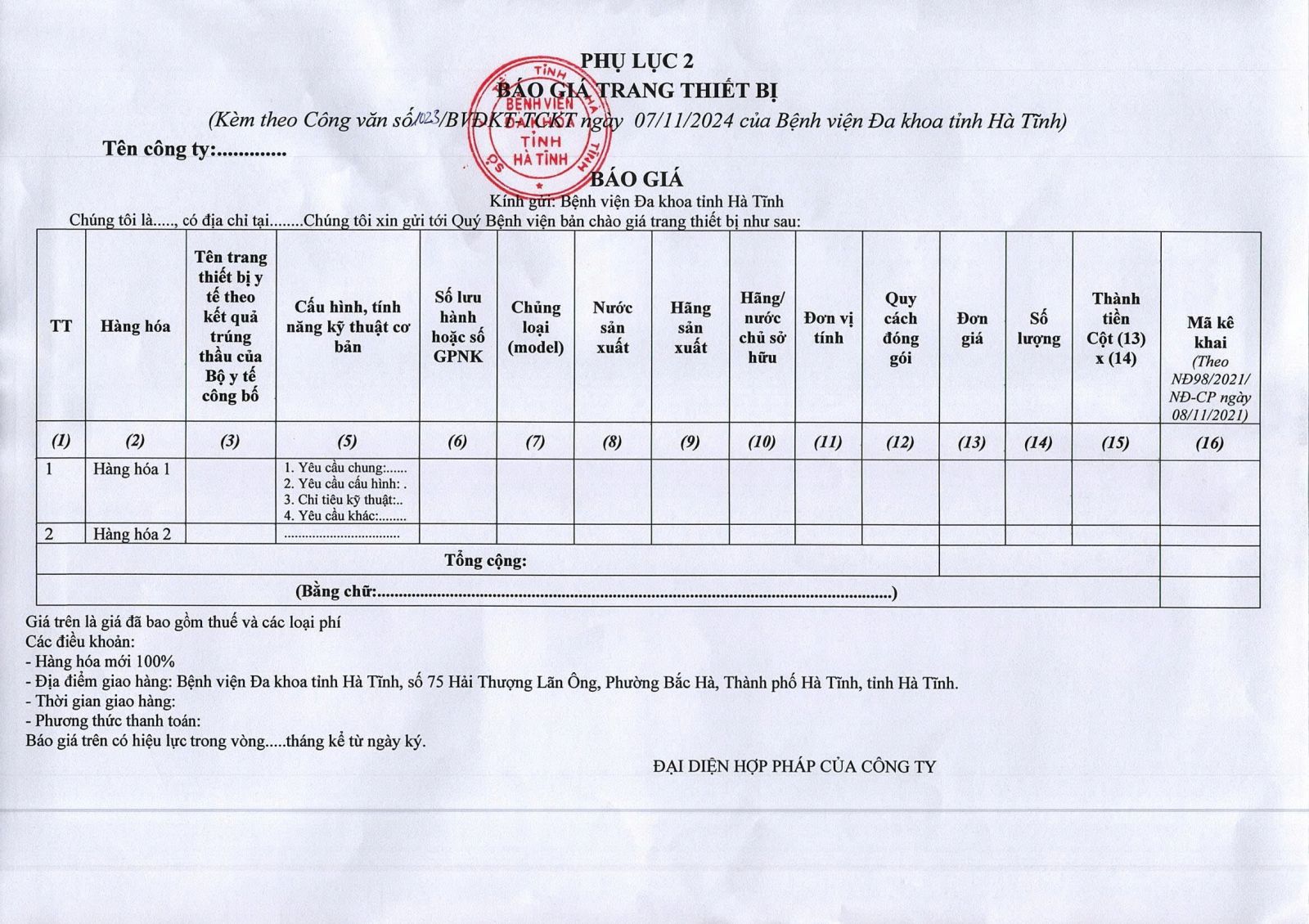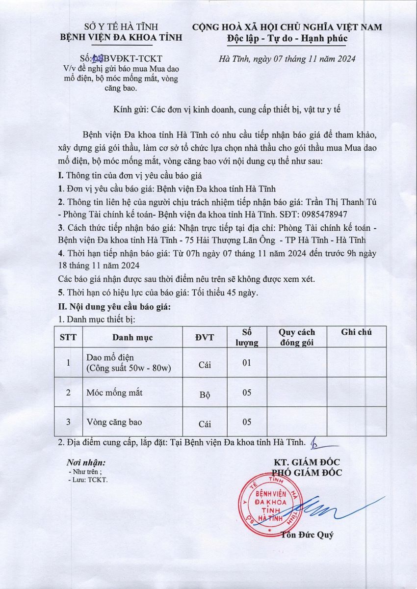 Bệnh viện Đa khoa tỉnh Hà Tĩnh có nhu cầu tiếp nhận báo giá để tham khảo, xây dựng giá gói thầu, làm cơ sở tổ chức lựa chọn nhà thầu cho gói thầu mua Mua dao mổ điện, bộ móc mống mắt, vòng căng bao với nội dung cụ thể như sau: