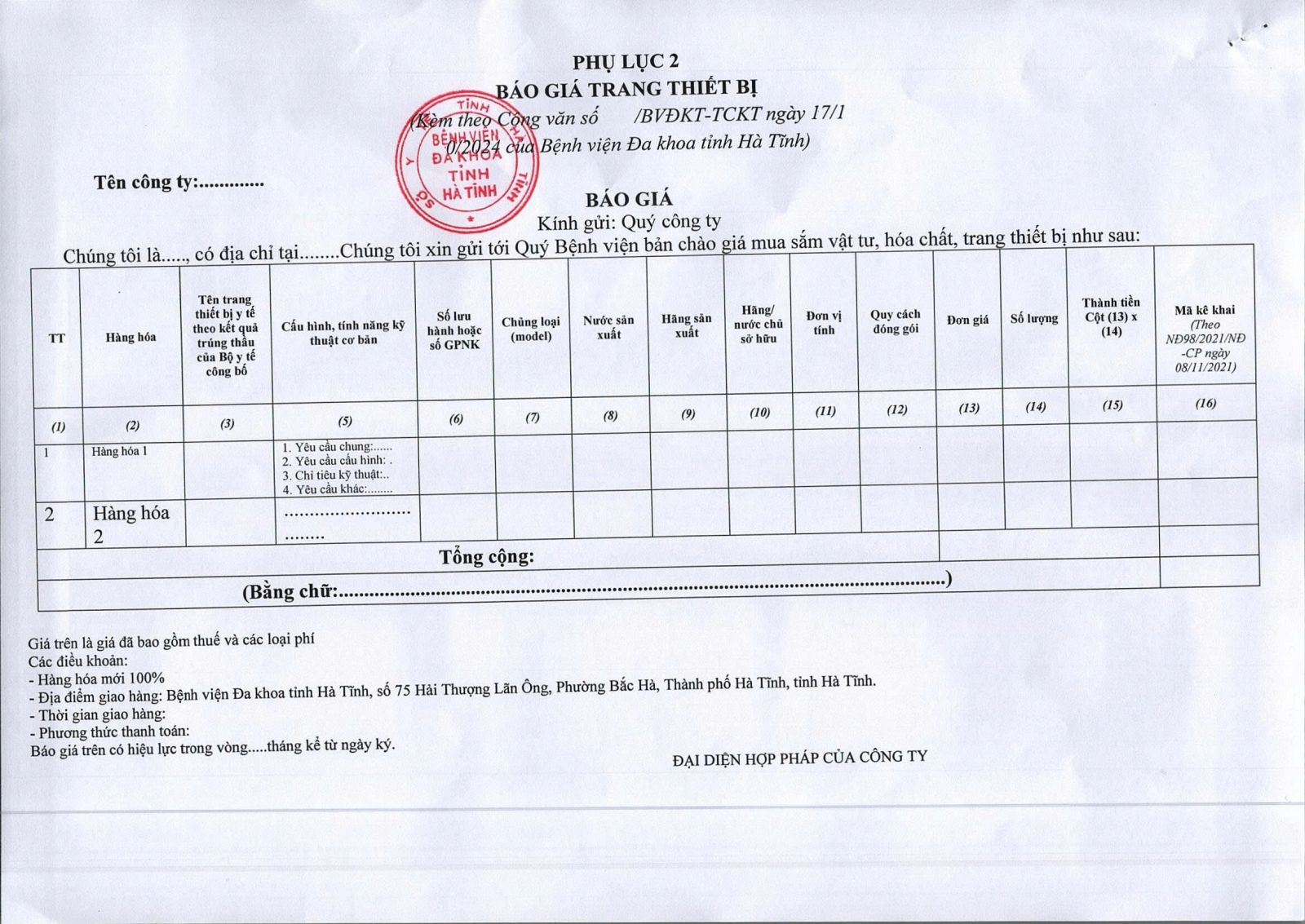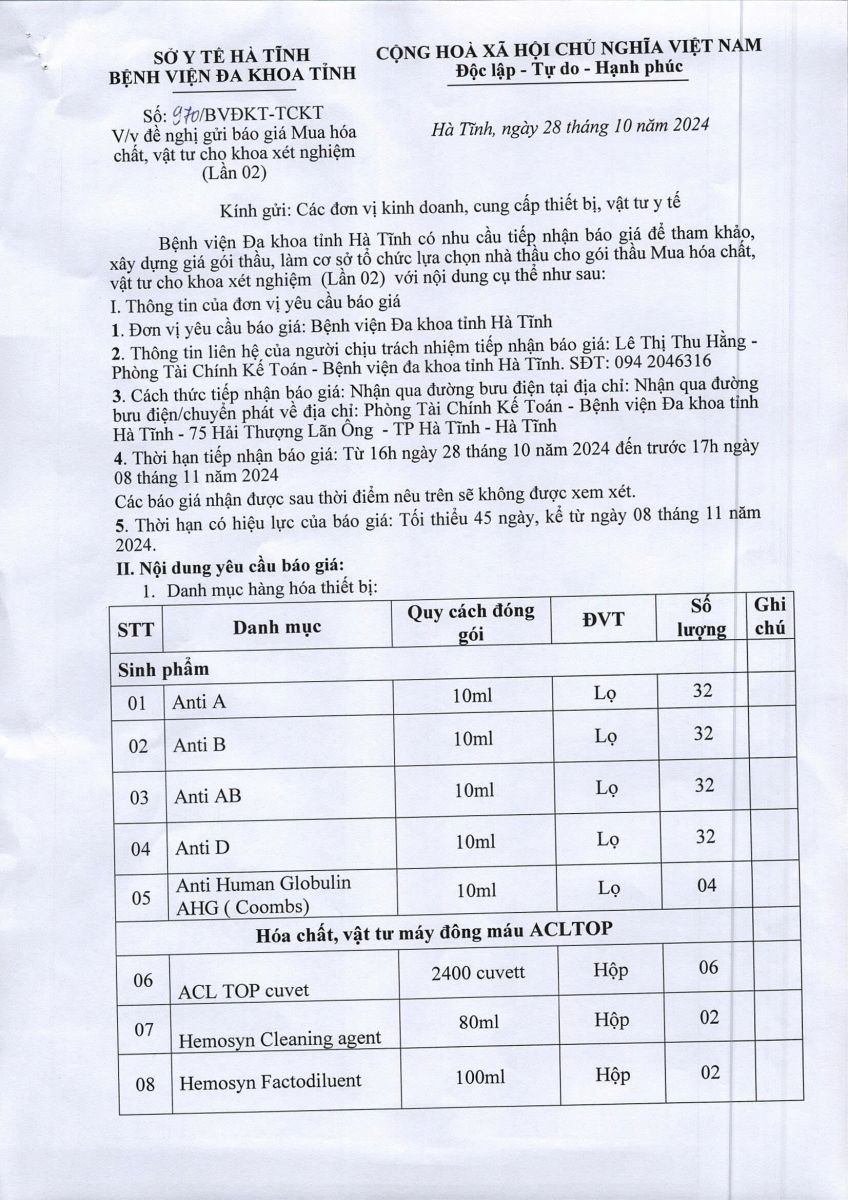 Bệnh viện Đa khoa tỉnh Hà Tĩnh có nhu cầu tiếp nhận báo giá để tham khảo, xây dựng giá gói thầu, làm cơ sở tổ chức lựa chọn nhà thầu cho gói thầu Mua hóa chất, vật tư cho khoa xét nghiệm (Lần 02) với nội dung cụ thể như sau: