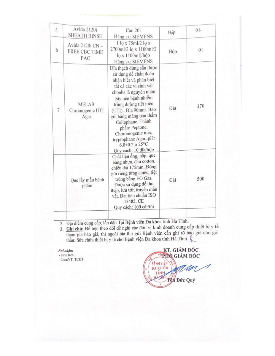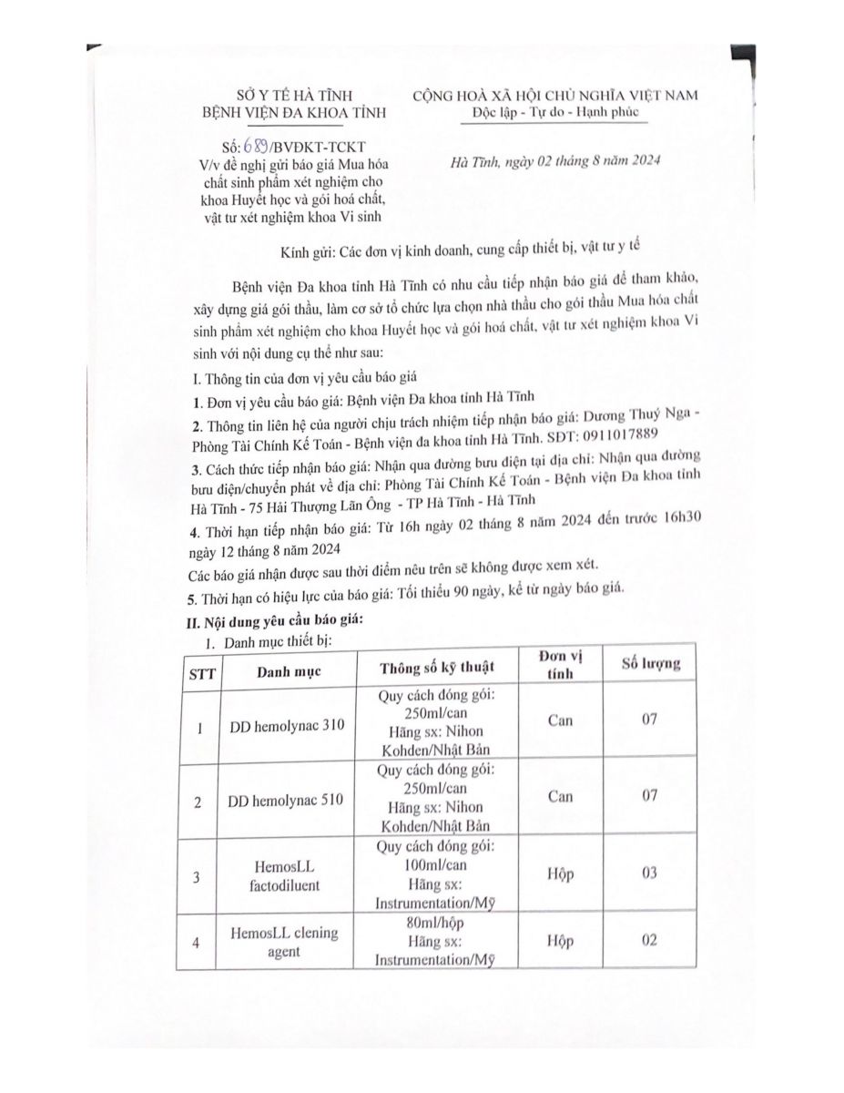 Bệnh viện Đa khoa tỉnh Hà Tĩnh có nhu cầu tiếp nhận báo giá để tham khảo, xây dựng giá gói thầu, làm cơ sở tổ chức lựa chọn nhà thầu cho gói thầu Mua hóa chất sinh phẩm xét nghiệm cho khoa Huyết học và gói hoá chất, vật tư xét nghiệm khoa Vi sinh với nội dung cụ thể như sau: