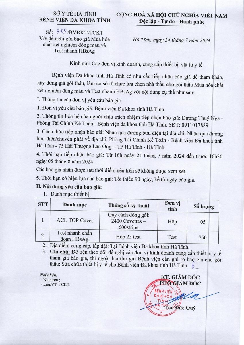 ệnh viện Đa khoa tỉnh Hà Tĩnh có nhu cầu tiếp nhận báo giá để tham khảo, xây dựng giá gói thầu, làm cơ sở tổ chức lựa chọn nhà thầu cho gói thầu Mua hóa chất xét nghiệm đông máu và Test nhanh HBsAg với nội dung cụ thể như sau: