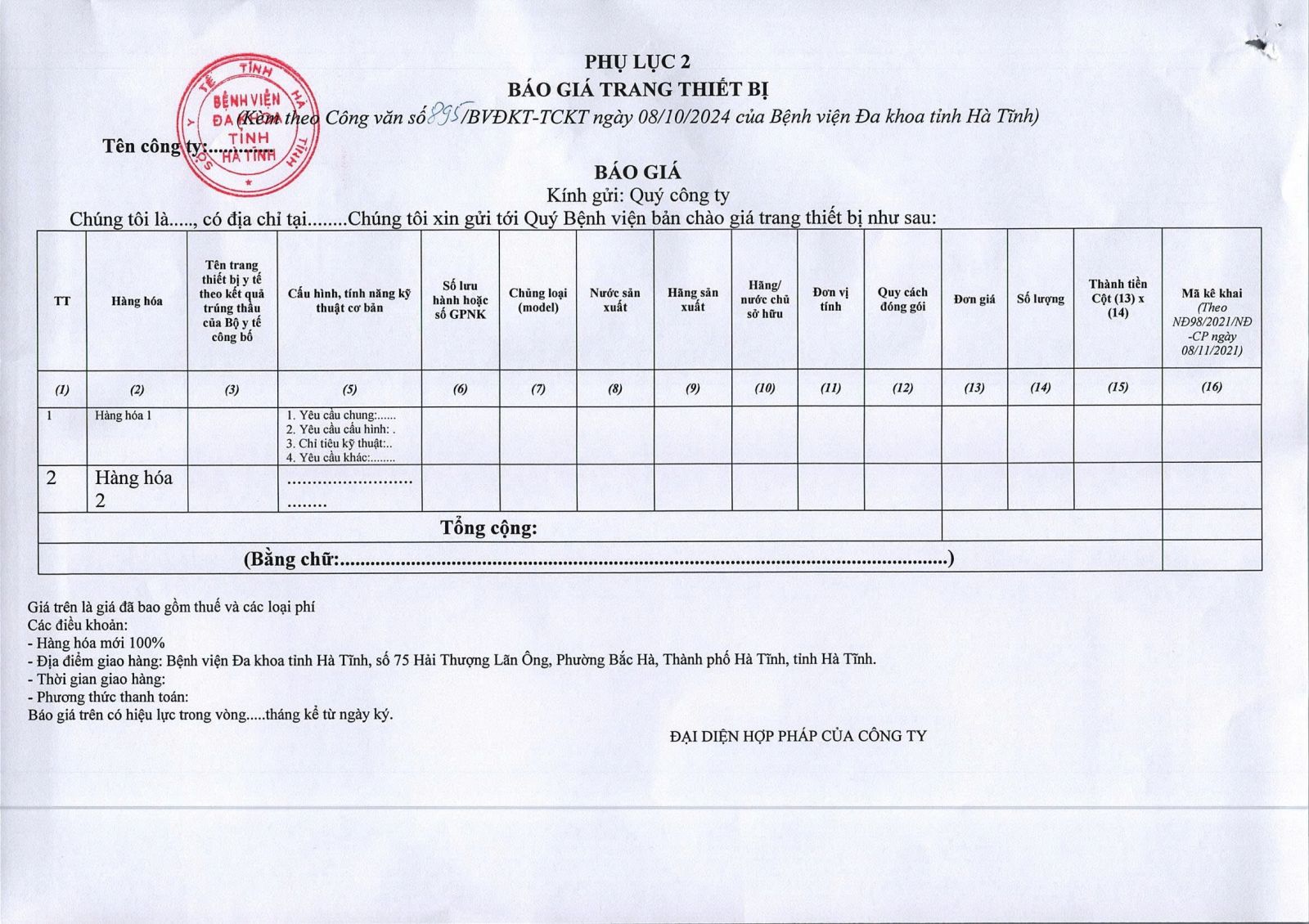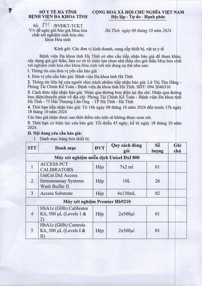 Bệnh viện Đa khoa tỉnh Hà Tĩnh có nhu cầu tiếp nhận báo giá để tham khảo, xây dựng giá gói thầu, làm cơ sở tổ chức lựa chọn nhà thầu cho gói thầu Mua hóa chất xét nghiệm sinh hóa cho khoa Hóa sinh với nội dung cụ thể như sau: