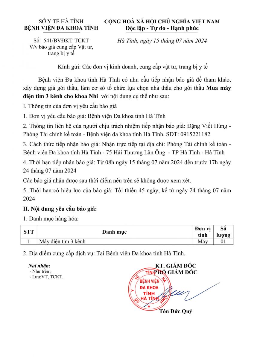 Bệnh viện Đa khoa tỉnh Hà Tĩnh có nhu cầu tiếp nhận báo giá để tham khảo, xây dựng giá gói thầu, làm cơ sở tổ chức lựa chọn nhà thầu cho gói thầu Mua máy điện tim 3 kênh cho khoa Nhi với nội dung cụ thể như sau: