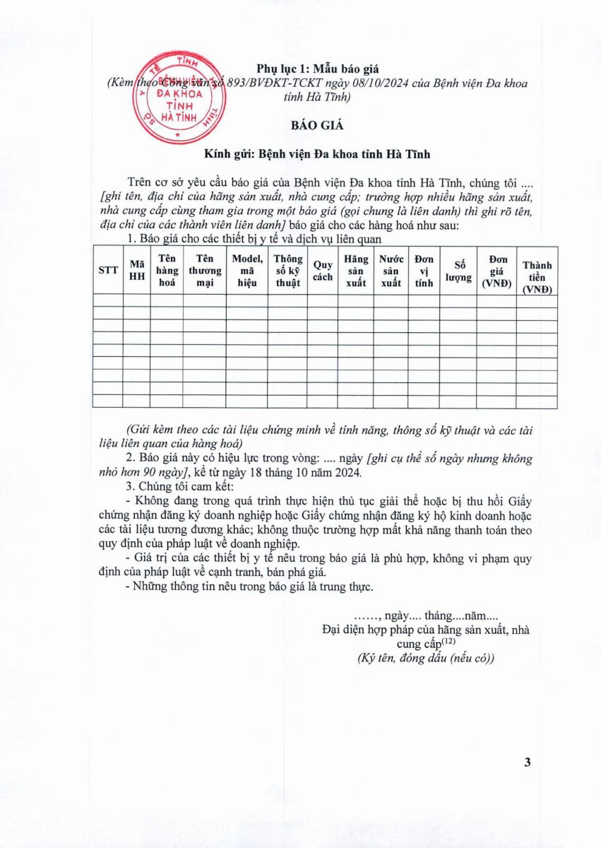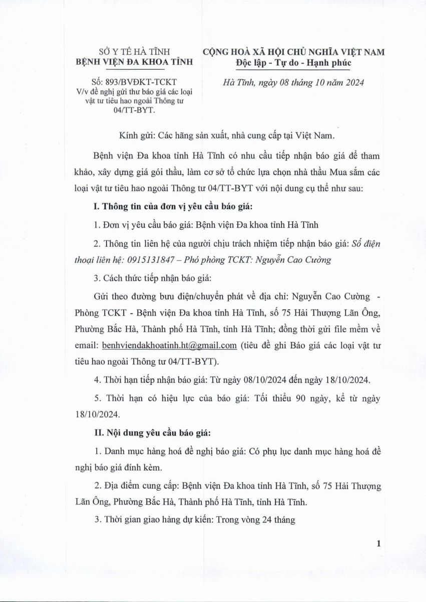 Bệnh viện Đa khoa tỉnh Hà Tĩnh có nhu cầu tiếp nhận báo giá để tham khảo, xây dựng giá gói thầu, làm cơ sở tổ chức lựa chọn nhà thầu Mua sắm các loại vật tư tiêu hao ngoài Thông tư 04/TT-BYT với nội dung cụ thể như sau:
